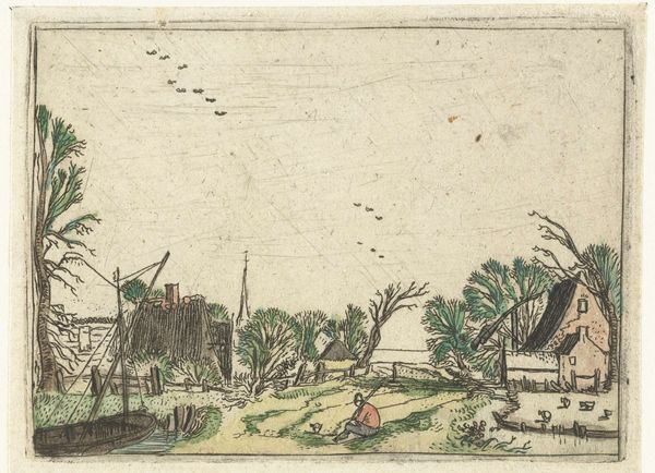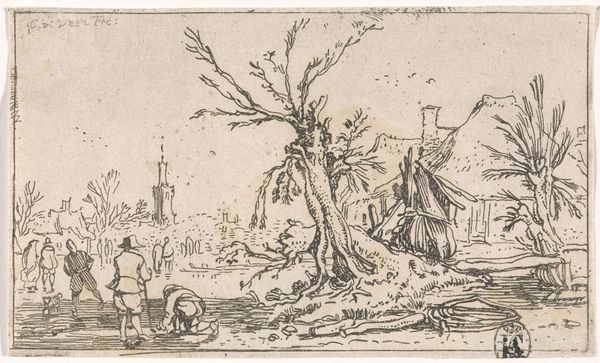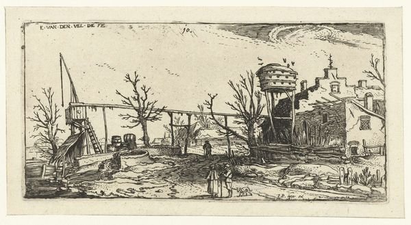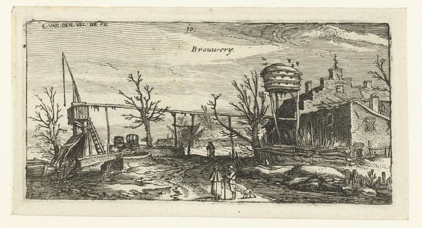 Curator: Esaias van de Velde's "Landscape with a Brewery," an etching, presents a slice of 17th-century life. Editor: Immediately, the composition strikes me—the stark, bare trees against the complex architecture evoke a feeling of quiet desolation. Curator: The brewery itself is significant. Such establishments were central to Dutch social life and economy, reflecting the burgeoning mercantile culture. Editor: Note the intricate linework! The artist uses hatching to create depth and texture, from the cloudy sky to the rough ground underfoot. Curator: And observe the figures—they are not merely decorative but suggest a narrative, hinting at the daily routines and social interactions within this landscape. Editor: It's all in the details, isn't it? The formal elements combine to create a microcosm, a world unto itself. Curator: Precisely, and studying those elements helps us understand the world that shaped it. Editor: A captivating piece. I find the interplay of light and shadow surprisingly powerful.
