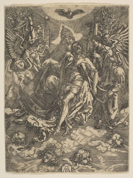 Albrecht Durer made this print, The Trinity, sometime in his career, using the technique of engraving. Here, a metal plate, likely copper, was painstakingly incised with lines to create a detailed image of the Holy Trinity amidst angels and clouds. The act of engraving demanded immense skill and control. Durer's mastery is evident in the variation of the lines, creating a full range of tones from bright white to deep shadow. This intense process, involving a precise transfer of design onto a metal plate, allowed for the production of multiple impressions, disseminating Durer's artistic vision widely. As a medium, printmaking was crucial to the distribution of knowledge and imagery. The labour-intensive process of engraving reflects a shift toward broader engagement with art and ideas, challenging traditional boundaries between the unique artwork and mass production. Appreciating the work involved in this method underscores the significance of printmaking in shaping cultural and intellectual life during the Renaissance.