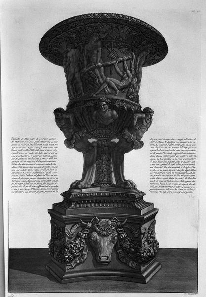 Here we see Giovanni Battista Piranesi’s detailed rendering of the Trajan Column, meticulously assembled from six boards. The somber palette of blacks, whites, and grays lends a gravity to the architectural form. Piranesi directs our eye upwards, starting from the bulbous base to the figures above which seem to carry the weight of the world upon their shoulders. The composition uses a structural interplay between the weight-bearing figures and the globe above. This tension could reflect Piranesi’s broader commentary on the burdens of history. The rigid exactness, evident in the architectural details, contrasts with the expressiveness of the figures. This suggests a blend of the rational and the emotive. Piranesi presents a commentary on the grandeur of Roman architecture, using a visual language that oscillates between reverence and critique. As you contemplate this etching, consider how Piranesi uses form not just to depict, but to engage with the symbolic weight of antiquity itself.