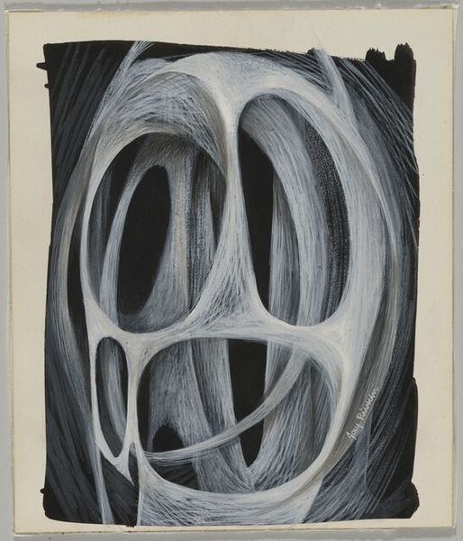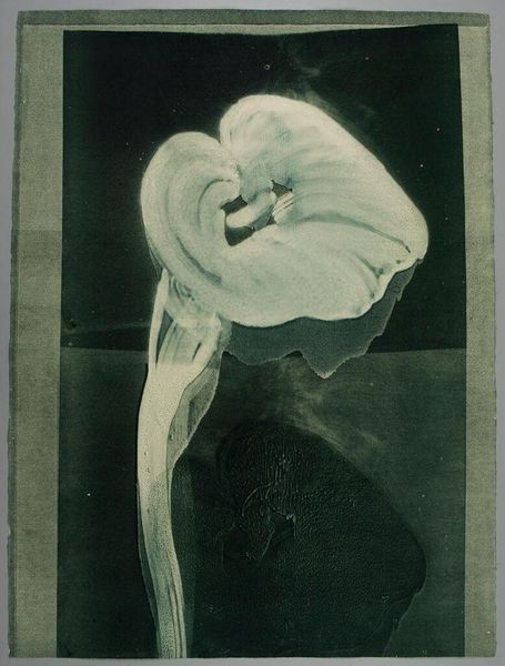 Curator: Here we have Michael Mazur's "Gesture of the Calla, 4" which resides here at the Harvard Art Museums. The print shows a calla lily in a study of dramatic chiaroscuro. Editor: It's striking. The dark background really makes the lily seem to emerge, almost as if it’s caught in a spotlight on a stage. There's such tension between light and shadow. Curator: Yes, Mazur's work often engages with dramatic contrasts to explore the relationship between figure and ground. He often showcased art's engagement with social issues. Editor: Callas themselves have such loaded symbolism, right? Purity, rebirth... but also associated with funerals. I wonder if Mazur was playing with that duality. Curator: It's possible. Mazur was an artist deeply involved in the political issues of his time. His art also reflected broader anxieties. Editor: The gesture of the flower, drooping almost, adds to that sense of melancholy. A complex piece, indeed. Curator: It certainly encourages a deeper contemplation of both beauty and the shadow of its passing.
