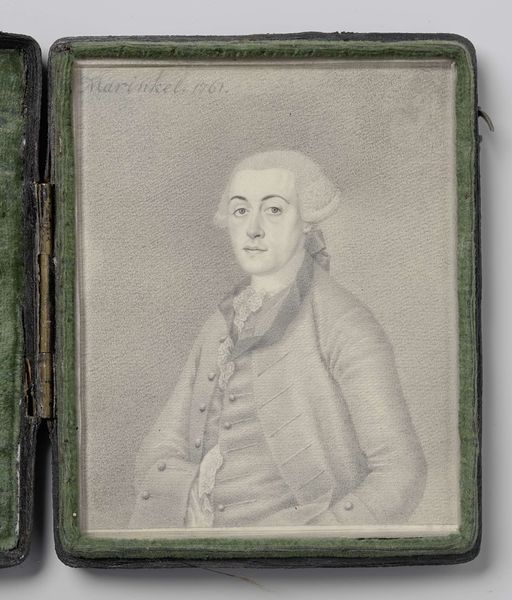Editor: This is *Mandsportræt*, a miniature portrait created with oil paint some time between 1756 and 1804 by Cornelius Høyer. I'm struck by the way the formal attire contrasts with what looks like a somewhat whimsical, almost dreamy, background. What are your initial thoughts? Curator: Oh, what a dandy! I’m immediately transported – almost like falling into a Jane Austen novel. Isn’t it interesting how Høyer captured both the sitter's vanity, reflected in his elaborate garb, and a sense of vulnerability with that slightly quizzical gaze? The lush background softens what could have been an exercise in pure aristocratic showmanship. I can almost smell the perfume. Do you feel that contrast as well? Editor: Absolutely. There’s a real tension there. I’m wondering if that dreamy background symbolizes the sitter’s inner life or perhaps some unattainable ideal? Or am I reading too much into it? Curator: No, not at all! I often think portraits from this era try to present a fantasy—one of control and idyllic landscapes just beyond grasp. But maybe, just maybe, Høyer is letting us peek behind the curtain a little. He lets the colors blend seamlessly, not in such a crisp baroque manner. That could mirror an acceptance of nature, almost like Rousseau advocated. Editor: That's fascinating. So, beyond just recording a likeness, the artist subtly hints at deeper, more progressive ideas? Curator: Exactly. And, of course, we must remember these miniature portraits were often deeply personal objects – mementos to be carried, gazed upon in secret. Who knew powdered wigs could contain so much! I hadn't considered the role nature played for him! Thanks. Editor: Indeed! Thinking about it now, I'll never look at 18th-century portraits quite the same way. Thank you!