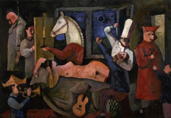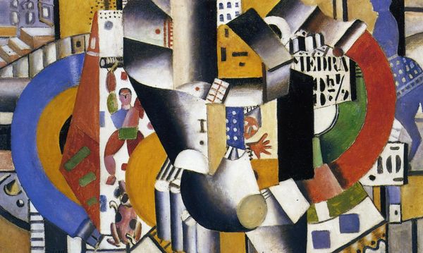 Editor: Here we have "Married Life," an oil painting by Roger de La Fresnaye, created in 1913. I find it a little… unsettling. There's this strangely geometric nude woman and a very proper gentleman, seemingly disconnected within the same space. What’s your take on this piece? Curator: The seeming disconnect is exactly the point! Consider the context: it's 1913, societal expectations around marriage were rigid. This isn't just a portrait; it's a statement on the roles people play. Notice how Cubism is used here—fragmentation mirroring the fragmented reality of modern relationships, specifically bourgeois relationships and marital tensions. Why do you think La Fresnaye chose to depict them in such contrasting styles, she nude and him in formal attire? Editor: Perhaps to emphasize their differing positions or roles? He’s confined by social expectation, represented by the suit, while she's... freer? Is it supposed to be empowering? Curator: Empowerment is one reading. Another perspective is examining the power dynamics inherent in the male gaze. He's actively observing; she's passively displayed, arranged almost as an object among the other domestic objects in the scene. Does this contrast challenge or reinforce those power structures? The book he’s holding could mean that he is an educated male that does the intellectual labor versus her role within the private sphere? Editor: That’s fascinating. So, it’s not necessarily a straightforward celebration of modern marriage, but more of a critical examination of its underlying dynamics and social constraints during that era? Curator: Precisely. The beauty of the artwork resides in these complexities, it sparks critical debate about socio-historical expectations related to men and women. Editor: I'll never look at another early modern painting the same way again! I appreciate you broadening my view beyond the aesthetic and digging into socio-political history! Curator: It's a perspective shift, and one that, in my opinion, adds layers of meaning to art that are really intriguing and not seen by many, which is why it’s so undervalued in the general field of art.
