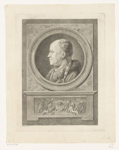 This is a print of Johann Beckmann, made by Christoph Gebhard Grape. The image speaks to the rise of celebrity and the institutionalization of knowledge in the 18th century. Prints like this one circulated widely in Germany and beyond, allowing the public to connect faces to names. Johann Beckmann was a professor of economics at the University of Göttingen, an institution that pioneered the modern research university. The framing of the portrait emulates classical cameos, associating the subject with the learning and prestige of the ancient world. The garlands and inscription below further enhance this sense of importance, monumentalizing Beckmann as a figure of public significance. Understanding this print requires attention to the history of universities and the development of print culture. Primary sources like university records, publishers' catalogs, and personal correspondence can reveal how figures like Beckmann gained prominence and how their images shaped public perception.