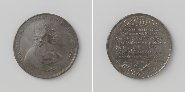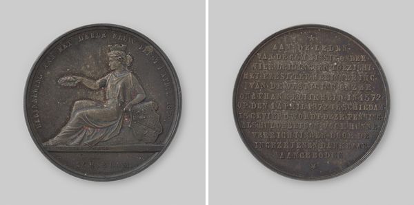 This medal was crafted by Franciscus Johannes de Hondt to honor the Koninklijke Maatschappij van Vaderlandsche Taal- en Letterkunde te Brugge. Observe the allegorical figure of Minerva, the Roman goddess of wisdom, art, and strategic warfare. Here, she is seated, holding a laurel wreath, a symbol of victory and honor, towards a stack of books. The image recalls the classical tradition, echoing the ancient Greek ideal of uniting intellect and virtue. The laurel wreath, originating from the Delphic laurel associated with Apollo, has appeared throughout history, adorning emperors and poets alike. Its cyclical journey from ancient Greece to the Renaissance and beyond speaks to our collective, perhaps subconscious, desire to immortalize achievement. Minerva's presence is meant to evoke a sense of intellectual authority and cultural pride. The wreath reminds us of the enduring power of symbols to convey complex ideas and emotions, bridging the gap between past and present.