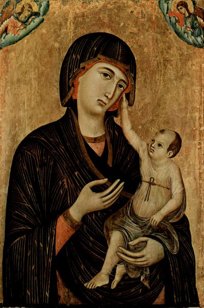 Editor: This is Duccio's "Madonna and Child," a tempera painting from 1305. I find the muted color palette quite striking, especially given the subject matter, it lends it a solemn feel. How do you interpret this work within its historical context? Curator: Well, considering its public role at the time, it's interesting to think about how Duccio navigates both the sacred and the accessible. Images like this were powerful tools, weren't they? Displayed in churches, they aimed to instruct and inspire devotion, all the while solidifying religious authority. What effect do you think her melancholy expression would have had on viewers then? Editor: I suppose it would make her more human, relatable even. Almost as though she knows what’s to come for her child. Does the Renaissance aspect make this different from purely medieval depictions? Curator: Exactly, the humanistic elements that come into play around the early Renaissance were in their early phases when this painting was made. Although it's religious iconography, the shift toward a more naturalistic portrayal of Mary and the Christ child indicates a change in artistic and, perhaps, social values. And where would such paintings typically be displayed? What social class would mostly be exposed to them, originally? Editor: Churches and wealthy patrons’ homes, so that access was curated for everyone from lay people to the aristocracy. That makes the choice of emotion displayed an informed choice to reach across class. That’s really interesting; it wasn't something I’d thought of before. Thank you! Curator: You're welcome! Analyzing art in terms of its social reach brings to light many things to think about when in our encounters with paintings like this.