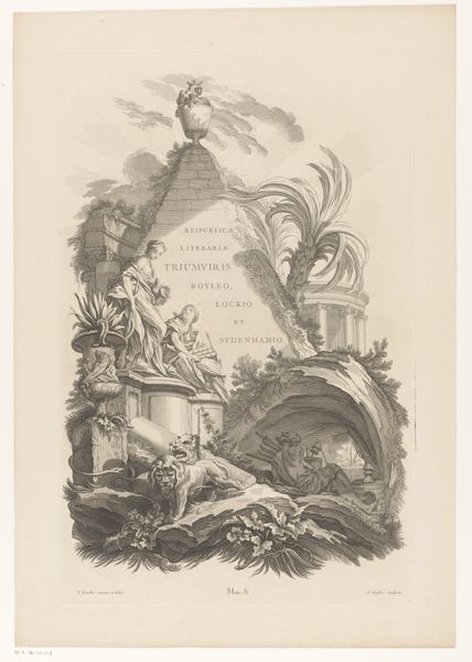 Editor: This is “Bewapend figuur wijst naar een monument in een landschap met Romeinse ruïnes” by Johann Oswald Harms, made in 1673. It appears to be an ink engraving. There’s something almost theatrical about the way the figure points amidst all these ruins. How do you interpret this work? Curator: The means of production are crucial here. Think about the engraver's painstaking labor, using simple tools to transform metal into a printing plate capable of reproducing this image for a wide audience. Notice how the dense network of lines, etched with considerable effort, depicts both grand architecture and natural decay. How does that materiality influence your perception? Editor: It's fascinating to consider the repetitive, almost meditative, work involved. It really makes me appreciate the distribution of this single image and how each print spreads an idea. The decay, and the figure, feels connected to this. Curator: Exactly. Harms presents not only the aesthetic value of ruins but considers their practical use as raw materials, remnants of previous production cycles re-integrated into later ones, even turned into capital via artmaking. Are we really looking at melancholic contemplation or disguised commentary on resource exploitation and cycles of making and unmaking? Editor: So, this isn't just romanticizing ruins, it's looking at what they were made of and what they become, connecting artistic labor, social context, and the lifecycle of materials? That's incredible! Curator: Precisely. Consider also the audience for whom these images were created, how such printed works fueled early forms of tourism, and brought landscapes into private collections for study and admiration. Editor: I see, the consumption and transformation of both resources and visual information become intertwined in this single print. Thanks! Curator: The layers of artistic choices and socio-economic reflections invite an understanding that art embodies so much more than mere aesthetic or historic qualities!