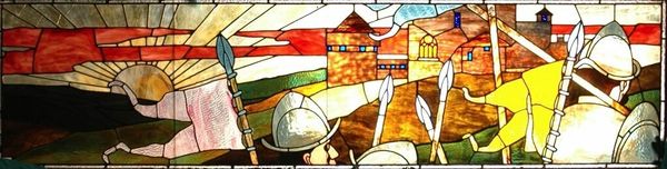 Fernand Léger created this mosaic model for the crypt of the memorial at high Mardasson. It presents a composition of abstracted figures and symbolic forms within a semi-circular frame. The work evokes a sense of solemnity through its bold colors, geometric shapes, and stylized representation. Léger employs a visual language characterized by simplification and standardization. The figures, rendered in blues and whites, stand in contrast to the central motif of a brown cross encircled by a vibrant, multi-colored halo. This juxtaposition creates a dynamic tension, inviting reflection on themes of faith and humanity. The composition reflects Léger’s broader interest in the interplay between abstract form and figurative representation. Note the strategic use of line and color, and how these elements create a sense of depth and movement despite the work's flattened perspective. Léger challenges traditional artistic conventions, offering a modern interpretation of religious iconography. The mosaic model acts as a potent symbol that acknowledges the past while embracing new forms of visual expression.