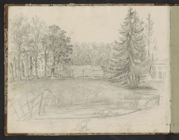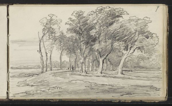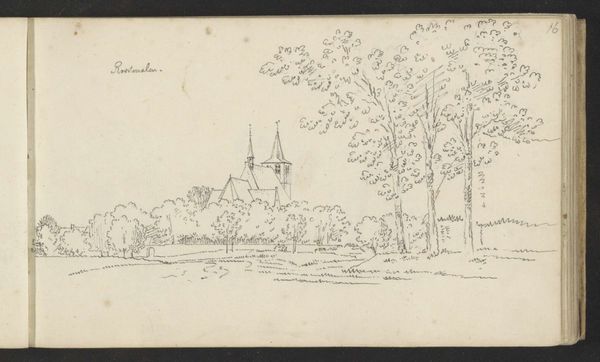 Curator: Welcome. Before us is "Dorpsgezicht te 's-Graveland," a drawing executed around 1732 by Abraham de Haen the Younger, currently residing in the Rijksmuseum. It is a landscape rendering utilizing pen and ink. Editor: Immediately striking is the simplicity of the line work; it’s raw, almost like a fleeting observation captured directly from life. There's an unvarnished quality about the materials. You can almost smell the ink and feel the grain of the aged paper. Curator: Indeed, the unadorned aesthetic allows for a close examination of form and structure. The composition adheres to a discernible logic, using the trees to create strong verticals and dividing the landscape into distinct planes. Note how the linear perspective leads the eye towards a vanishing point, crafting an illusion of depth within a two-dimensional space. Editor: Absolutely, and if we focus on the ink itself, it feels like we’re witnessing the residue of artistic labor—a direct link to the artist's hand. How was the ink sourced? Was it handmade, or a commercially available product? These material questions shed light on the artistic process. Also, the sketchbook context is essential. The raw aesthetic, hinting to field sketches, removes it from "high art" canon. Curator: Interesting. From a purely structural point, consider how the contrast between light and shadow generates a certain spatial dynamism. Notice how the distribution of ink, denser in the foreground, gradually diminishes towards the background, which enhances the impression of atmospheric perspective, providing an artifice. Editor: And I’m immediately drawn to that road; the suggestion of use, and its presence shapes the scene with life and invites speculation about the people who may have used it daily—what was carried, traded, transported. I find that element of material usage especially grounding and insightful, revealing stories within the composition. Curator: That said, consider the relationship of the trees' masses to the houses along the left, suggesting elements within baroque landscape composition to reinforce the image’s pictorial unity. It serves not as pure replication, but as artistic intent of pictorial composition. Editor: Examining "Dorpsgezicht," through both the material reality of its creation and its visual arrangement truly gives insights into its historical world, blending material origins to its place in art. Curator: Indeed. A study of line and a glance into time, held by ink and paper.