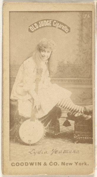 Curator: This is card number 102 from the "Actors and Actresses" series, featuring Vernona Jarbeau, produced by Duke Sons & Co. in the 1880s to promote Cameo Cigarettes. It is currently housed at the Metropolitan Museum of Art. Editor: Oh, my. This gives me the strange sensation of holding a lost secret, like a whispered promise from a time that prized a peculiar theatricality. The sepia tone seems to amplify the sitter’s aura; she is, at once, an intimate yet untouchable figure. Curator: Yes, the sepia toning speaks volumes. It immediately links the image to the era, grounding the actress, Vernona, within a specific historical and cultural context. The gesture of her hand, the cut of her outfit – they each serve as signs pointing towards late 19th-century modes of performance and presentation. Editor: The pointed finger does indeed draw you into her world. A performative beckoning towards a realm unseen by our own eyes. Are we the stage, then? Or something else altogether? Her attire suggests the vaudeville tradition – short dress, elaborately trimmed stockings – that was the popular culture of the day, doesn't it? Curator: Exactly! The commercial nature of the card itself reveals a great deal. These cards functioned as collectibles and trade stimulators, yes, but their use of performers highlights the intertwined relationship between celebrity culture and product endorsement. It's also worth noting that photographs, like these, served as a popular portraiture for public figures during the later parts of the 1800's. Editor: I like that idea, seeing it as an accessible mode of portraiture. And while the cigarettes and her image seem unconnected today, there must be some connection. Did her persona reflect that product’s desired qualities perhaps? Freedom? Audacity? Curator: It's not merely about a superficial association. The image tapped into pre-existing notions of glamour, luxury, and aspiration. This intersection created meaning. And now? It serves as a material cultural record from a distant cultural moment, viewed today from within our own distinct cultural moment, thereby gaining further interpretive complexity through the act of continued observation. Editor: Looking at Vernona, it all seems suddenly connected—the puff of smoke, the promise of entertainment, even the strange confidence in her gaze. So many lost universes within this single fragment! Curator: Indeed. And that fragment carries far more semiotic weight than we might imagine at first glance.