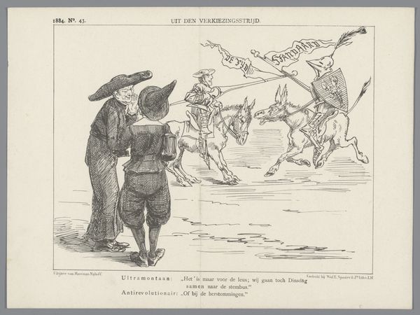 Johan Michaël Schmidt Crans made this print in 1884, and it offers us a window into Dutch politics at the time. It depicts a parliamentary debate, but it is not a straightforward record. The artist satirizes the proposal of Mr. Keuchenius regarding party names in the Second Chamber. The image creates meaning through visual codes. For example, the different types of hats worn by the figures around the table symbolize their political affiliations, referencing old Swedish party names like "Hats" and "Caps". The artist uses humor to comment on the political landscape of the Netherlands, suggesting a preference for traditional party divisions over the current state of affairs. This print critiques the contemporary political institutions by poking fun at the parliamentary process. Understanding this artwork requires historical context. Researching Dutch parliamentary history of the 1880s, especially the debates around party organization and the role of figures like Keuchenius, would enrich our interpretation. Art like this reminds us that its meaning is deeply rooted in its social and institutional context.