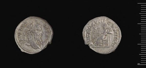 Curator: Here we have a Denarius, a silver coin, of Septimius Severus. The coin itself is attributed to Septimius Severus. Editor: It looks worn, doesn't it? But still, that profile, sharply etched into the metal, it feels like holding a whole world in your palm. Curator: The act of minting currency was, of course, a concentrated display of Roman power; control of material production and its dissemination throughout the empire. Editor: It makes you wonder about the hands this has passed through, the everyday transactions, the secrets it’s silently witnessed. You know, the lives this coin helped shape, however marginally. Curator: Indeed, the coin's weight, 3.11 grams, also dictated its purchasing power, a tangible measure of labor and value in its time. Editor: Exactly, and that's what gives it such a strange, almost heartbreaking beauty. Curator: A testament to the intricate dance between human ambition and material reality. Editor: Yes, a whole drama compressed into a small silver disc.