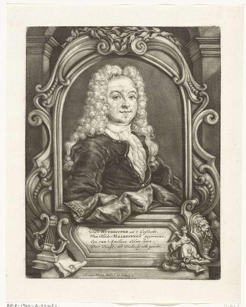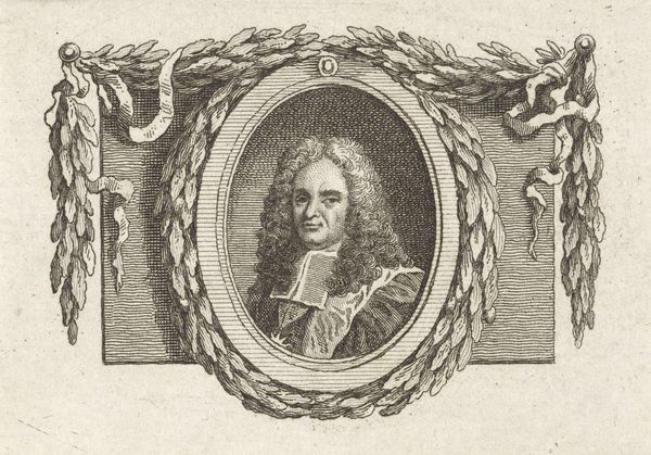Curator: This engraving presents us with a portrait of Vincenzo da Filicaja, an Italian poet and senator. It was created sometime between 1677 and 1730 by Cosimo Mogalli. Editor: It’s quite striking! The textures in the wig, the fine lines... There’s a real sense of depth created solely through line work. Curator: Yes, the artist certainly excelled at capturing Filicaja's likeness, but I am drawn to the context. This image participates in a broader discourse around power and representation during the late Baroque period. We see a deliberate crafting of identity here, a visual articulation of Filicaja's status within Florentine society. Editor: I agree about status. I immediately focus on the composition. The oval frame, the detailed ribbons...these design elements reinforce the sitter’s importance and help direct our eye. Mogalli manipulates line and form masterfully to suggest not just likeness, but also character. Curator: Looking at the way Filicaja is positioned, with his gaze meeting ours head-on, speaks volumes. This wasn't merely about documenting a face; it was about projecting an image of authority and intellectual prowess. We need to recognize how such portraits served as tools in constructing and reinforcing the social hierarchies of the time. Also, as the composition uses old engraving styles, it invokes a certain feeling of renaissance, doesn’t it? Editor: Certainly. I do agree with you that the gaze is quite a deliberate element. And consider the Baroque frame itself, not merely decorative but also structural, dictating how we perceive the subject within. It is quite compelling, isn't it? Curator: Absolutely. By analyzing these images, we gain insight into how identity, gender, and power dynamics were negotiated and solidified during this transformative time in European history. This image provides an aperture into 17th century societal constructs. Editor: And, conversely, by studying the engraver’s formal choices, we gain insights into how a senator wanted to project a lasting image of authority in society, through the clever use of graphic tools, such as lines and contrasting densities. Curator: Indeed! An artwork that speaks of then, and prompts conversations for now. Editor: Quite right. A successful combination of graphic skill and self-assured power.