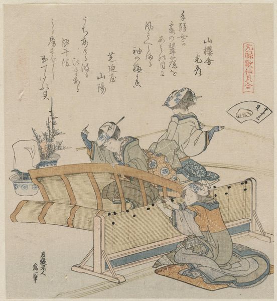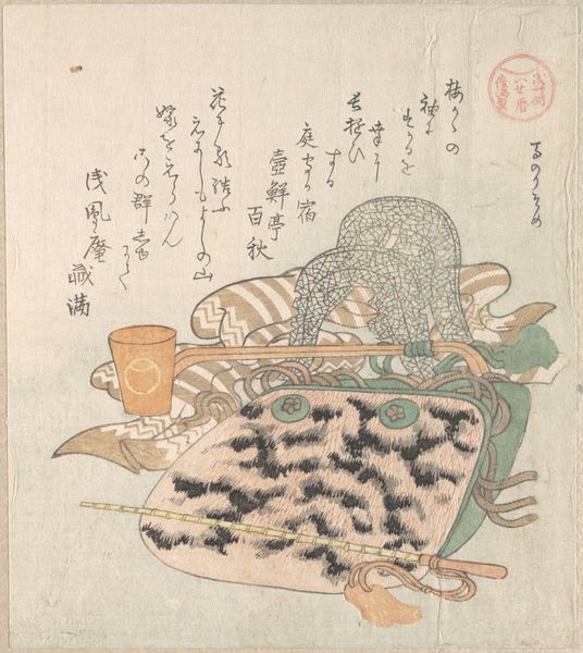 Curator: Hokkei, wasn't he just a brilliant observer? Here, take a look at "The Shitanomiya Rest Stop," a woodblock print from 1833, currently housed at the Rijksmuseum. My first thought is—what an interesting feeling of contained exuberance! Editor: Interesting… It’s such an intimate still life, yet hints at larger societal themes about travel and observation through this very confined scene of object arrangement. Are those…turtles swimming in a framed picture, under a cloth? Curator: Yes! Hokkei presents a framed painting of two turtles gracefully navigating a swirling blue stream, complete with its own drapery, plus paired vases with knotted golden cords on a serving table. It almost reads like a little stage, doesn’t it? Editor: Definitely a constructed performance. The turtles become symbols of longevity and good fortune, right? But held captive within art… Is Hokkei commenting on the commodification of luck, perhaps reflecting the Edo period's evolving class structures and expectations, the merchant class rising within the old order? Curator: It’s all so delicately rendered! See the varying line weights? The way the water curls almost flirtatiously around the turtles? Even the glaze on the vases feels…present. Do you think the drape over the frame alludes to revealing secrets, like the magician just about to disclose how the rabbit got in the hat? Editor: Could be, but that curtain might be also hiding social imbalances in plain sight. Maybe Hokkei uses the visual pleasure to invite viewers in, only to then consider what lies beneath such displays. The artifice of the composition is pretty loud, isn’t it? It does question authenticity—whether social or emotional. Curator: Right, and that tension elevates it beyond mere decoration! I think it prompts introspection about seeing versus understanding. Or maybe, that it can also suggest the power that art can bring as an introspective portal? Editor: Maybe! I see it as an act of unveiling the hidden structures and the constructed meanings embedded within our own experiences. Curator: Thanks! As usual, you take my meandering thoughts somewhere insightful, which I think perfectly complements this tiny world created by Hokkei, it opens so many little doors of imagination. Editor: You’re very welcome! And just remember that beneath beauty lies a complex web of social construction!