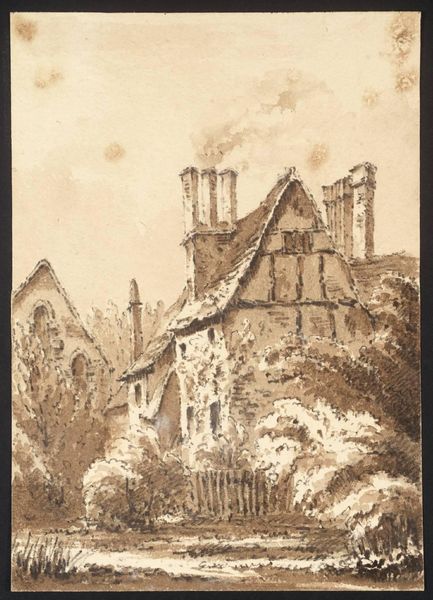 Editor: So, here we have Thomas Hearne's "A Vine-clad Cottage." I'm immediately struck by the cozy, almost dreamlike quality. The cottage seems to blend into the landscape. What do you think draws the eye in this piece? Curator: It's that very harmony, isn’t it? Hearne's use of delicate washes creates a sense of timelessness. I'm captivated by how the ivy embraces the building, blurring the line between architecture and nature. It's as though the cottage has grown organically from the earth. Editor: It really does seem alive. Curator: Indeed, it's a reminder of the sublime beauty in everyday scenes, and makes one wonder about the stories held within those vine-covered walls. Editor: I never thought about it that way, as a story! Thank you for your unique insight. Curator: My pleasure. Art is like that, you know, full of surprises.