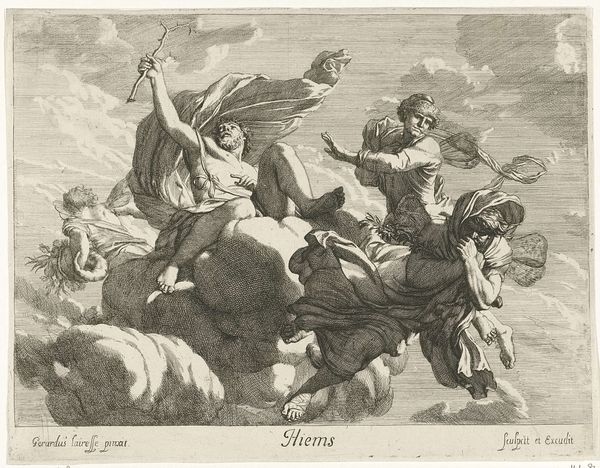 Editor: Here we have Jan Punt's 1751 engraving, "H. Gregorius van Nazianze de Jongere," currently held at the Rijksmuseum. It strikes me as a rather dramatic scene; a bishop and cherub are confronting some sort of winged monster. How do you interpret this work? Curator: The dramatic tension speaks volumes about the social climate of the 18th century and the anxieties surrounding religious authority. What appears as a simple religious scene is in fact layered with commentary about power, the challenges to orthodoxy, and perhaps even the emerging Enlightenment ideals. Notice how the figure of Gregory is positioned, almost as if enacting a forceful cleansing. Editor: So, the winged monster could represent something beyond a literal demon? Curator: Precisely. Think of the monster as representative of heresy, dissent, or any force challenging the established order. The cherub’s instrument almost weaponizes faith, forcefully imposing doctrine upon dissent. How might we understand this as a visual commentary on the suppression of differing viewpoints during that time? Editor: That gives the piece so much more depth. It's not just a saint defeating evil but a statement about the suppression of thought. Curator: Yes. Consider, too, the artistic choices: the use of engraving allows for meticulous detail, which was an incredibly accessible and democratic way to disseminate ideas in the 1700’s. Disseminating whose ideas, though, and to what end? Whose perspectives are being amplified and whose are silenced? Editor: I never thought about that angle before! Seeing the print as a piece of propaganda really shifts how I view its place in history. Curator: Indeed. It serves as a powerful reminder that art doesn't exist in a vacuum. It is intrinsically linked to the social, political, and philosophical currents of its time. Editor: That’s definitely something I will take into account moving forward when assessing artwork. Thanks!