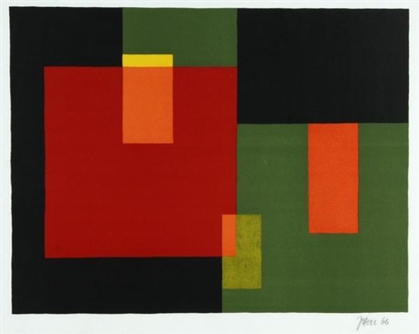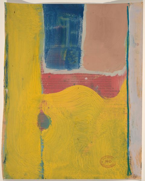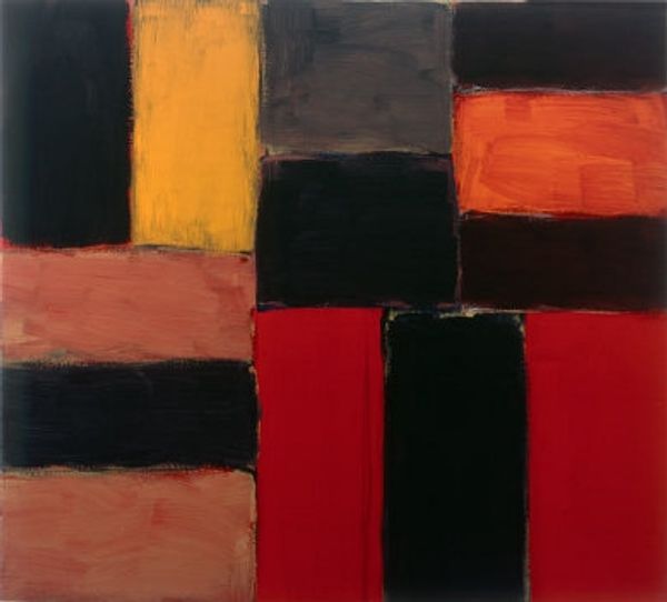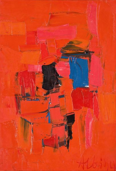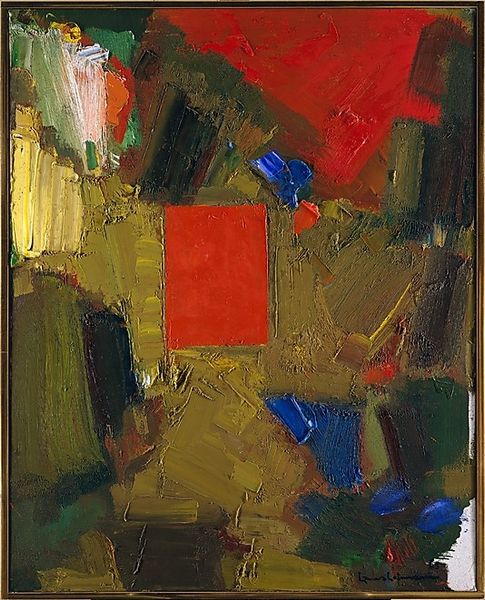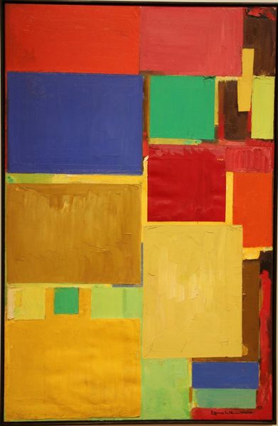 Editor: Hans Hofmann’s "Sanctum Sanctorum," created in 1962 with mixed media including oil and acrylic paint, really strikes me with its boldness. The impasto gives the colors such depth, but it almost feels… restless? What's your interpretation of it? Curator: Restless is a brilliant observation. Hofmann's Abstract Expressionism aimed to capture pure feeling, you see, and here, that energetic push and pull between the vibrant blocks is everything. Imagine Hofmann, in his 80s, still charging at the canvas. Doesn't that idea itself add to the dynamism? The "Sanctum Sanctorum," the holiest place – what does it suggest when rendered not as serenity, but this? Perhaps for Hofmann, the sacred place *was* the act of creation itself. Editor: That makes so much sense! I was stuck on the idea of a "sanctum" being peaceful. I didn't think about the creative act. Curator: And what IS peace anyway, darling? A perfect stillness? Or perhaps, a hard-won balance between powerful forces. Notice how those seemingly random rectangles actually hold each other in perfect tension. It's a visual argument. What do *you* think he's arguing? Editor: Maybe about how chaos and order are both always present, both necessary. Curator: Precisely! Hofmann found the sacred in that very struggle. It’s less about pretty, and all about potent. Something I need to be reminded of now and then. Editor: Me too. I'll never look at a rectangle the same way again! Thanks for this, it feels like I've unlocked a secret.
