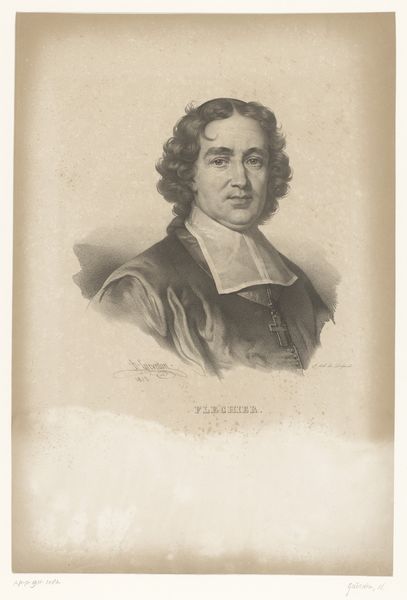 Editor: Here we have Nicolas Maurin's "Portret van Bartholomeus van der Helst," a drawing that was printed as an engraving, dating roughly from 1826 to 1852. The contrast between the lace and the sitter's face really pulls me in. What elements stand out to you in this piece? Curator: The lithographic and engraving techniques allow for a striking play of light and shadow, emphasizing the textures within the image. Consider how the meticulous hatching defines the contours of the face and the folds of the clothing. Note also the delicate rendering of the lace collar – the density of lines creates an almost palpable sense of texture against the smoother areas of the face and hair. It exemplifies how artists manipulated the limitations of reproductive print media to simulate painterly effects, and that is central to this piece’s structure. Editor: So you are focusing on the techniques that imitate painting within a print. But isn't the success of a portrait also reliant on capturing a likeness? Curator: Likeness, representation; these are indeed qualities that resonate on some levels. But observe how the linear qualities create rhythm through the composition and unify various textures within the form. What could be described as mere resemblance actually emerges from the artist’s adept manipulation of the medium's inherent characteristics. Semiotically speaking, the codes within the portrait function foremost to explore possibilities latent within the printmaking form itself. Editor: So, you're suggesting the print isn't just trying to look like a painting; it's using those elements to create something entirely new based on what engraving and lithography are able to achieve on their own terms? Curator: Precisely. Through acute formal arrangement, Maurin transcends simple replication and manifests unique expression through structural relationships born of material possibility. Editor: I see it now; it is less about what is represented and more about how those realistic qualities are achieved with this print style, and what that emphasis communicates. Thanks for expanding my perspective!