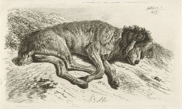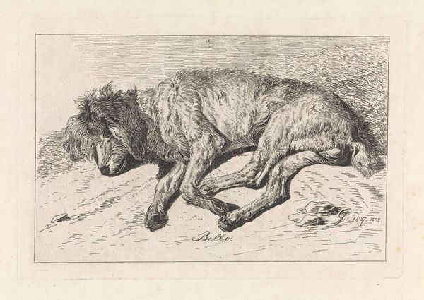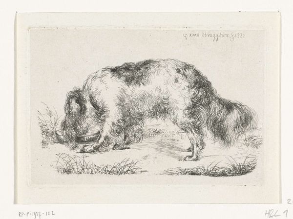 Johannes Mock etched this representation of a sitting dog by a shed, capturing the profound link between humans and animals. Dogs, long seen as symbols of loyalty and vigilance, evoke a sense of trust, mirroring the ancient role of dogs as guardians and companions. This motif of the loyal canine is ancient. We can trace it back to classical antiquity where dogs frequently appear in Roman mosaics, guarding thresholds and accompanying deities. This echoes in later depictions: think of the dog faithfully at his master’s feet in medieval tomb effigies. The dog's presence here transcends mere companionship; it's a powerful symbol. The fidelity of the animal touches deep emotional chords. The subconscious allure, the eternal return of this primal connection, reminds us of the timeless role animals play in reflecting our own societal values and emotional needs.