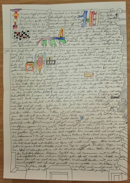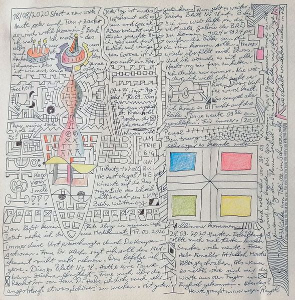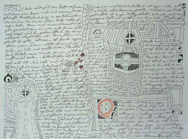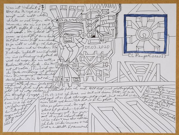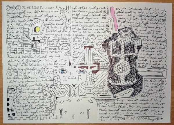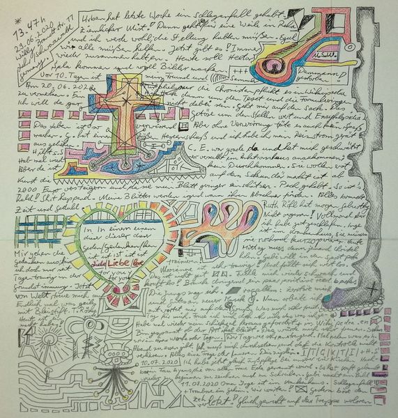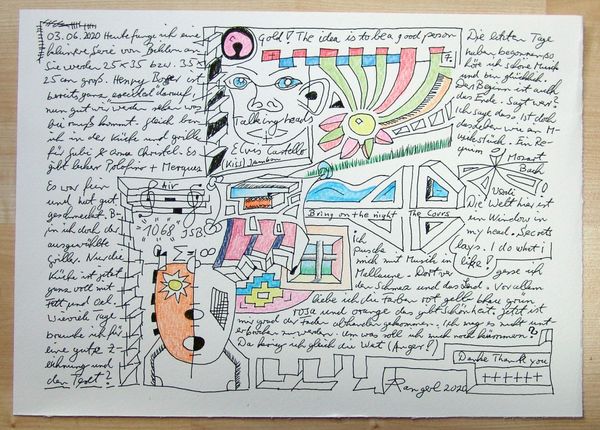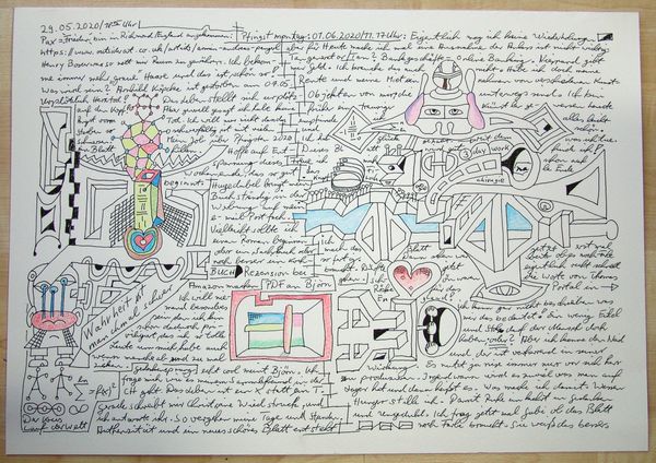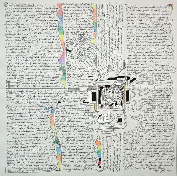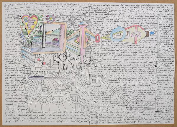 Made with pen on paper in Germany, this work by Armin Andreas Pangerl, titled Nr 24, presents us with an intriguing mix of image and text. The dense layering invites us to consider the relationship between personal expression and the broader world. The image creates meaning through visual codes, cultural references, and historical associations. The work seems to comment on the social structures of its own time and critiques the institutions of art. The writing is in German, and while the imagery is reminiscent of 20th century surrealism, the language used is contemporary. This gives us a sense of art's historical progress. As a historian, I am interested in the role of these kinds of notebooks. They can be a tool of self-expression, a challenge to social norms, or a form of institutional critique. Understanding the meaning of this art is contingent on understanding its social context, something we can do with the help of research resources.