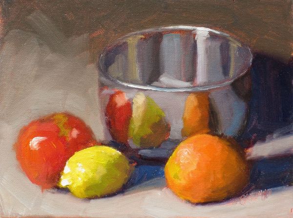 Scott Fraser painted these crabapples with oil on panel. What strikes me about this painting is how much time and looking went into it. I love the almost photographic detail, like the individual hairs on the stems. The color is so vibrant and the brushstrokes are soft. Fraser seems interested in capturing the essence of each object, imbuing the scene with a quiet stillness. The way the light catches the leaves and berries, creating a sense of depth and dimension. It reminds me a little of Janet Fish, in that she creates an emotional connection through meticulous observation. But the focus here is more on the subtle details, the way the light plays on the surface of the fruit, and the delicate balance of color and form. It's this focus on quiet observation that draws me in, inviting me to slow down and appreciate the simple beauty of the natural world.