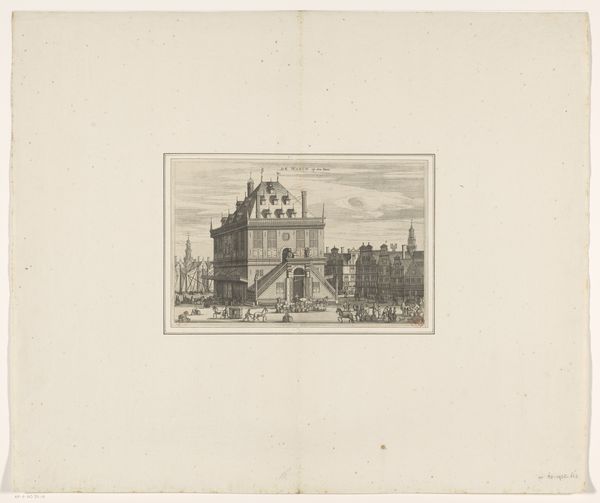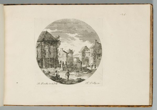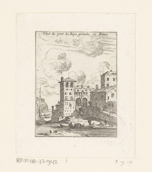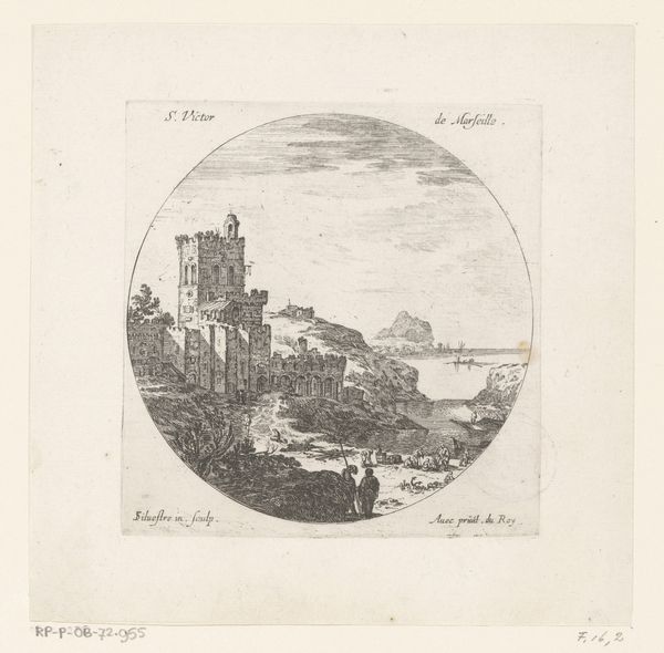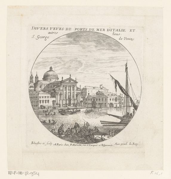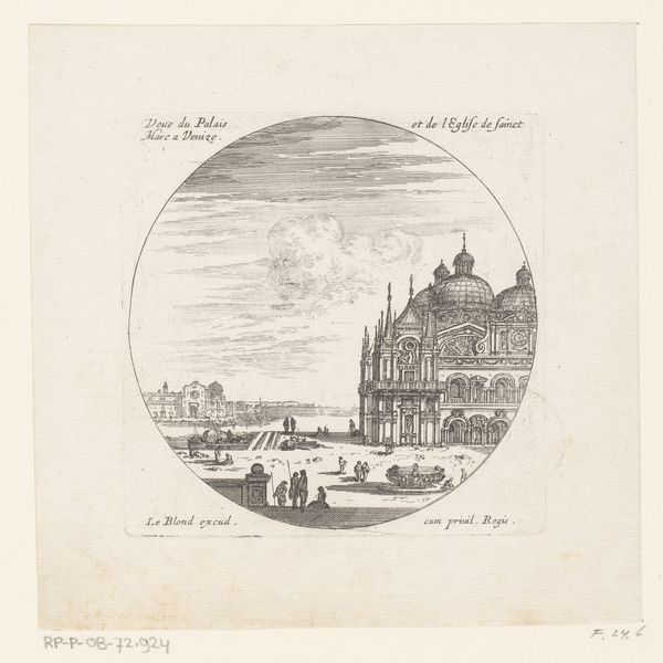 Curator: This etching by Israel Silvestre, made in 1647, presents a view of Venice with the Scuola Grande di San Marco. What strikes you first about this cityscape? Editor: Immediately, the crispness and the architectural detail—that delicate line work! It has this almost dreamlike quality, like looking at Venice through a very refined, slightly hazy memory. There’s a stillness to it, despite all those intricate lines. Curator: Silvestre’s known for his topographical prints, capturing places with incredible accuracy. But here, he’s also working with a certain amount of Baroque theatricality. The buildings aren't just recorded, they’re presented, aren't they? Editor: Absolutely. The choice to confine the view within a circle, it feels symbolic, almost as if Venice is a world unto itself. But also, consider who Silvestre was catering to. Prints like these were luxury souvenirs, ways for the elite to commemorate their Grand Tour adventures. So it's not just Venice; it's the idea of Venice being consumed. Curator: And beyond just a travel memory, Silvestre also seems to be making some kind of political statement about powerful Venetian institutions through his close depiction of La Scuola Grande di San Marco. Editor: The presence of La Scuola, as a powerful lay confraternity dedicated to social and spiritual enhancement through service, tells its own story. Lay piety during this period can't be extricated from everyday experience. Consider the presence of disease, social isolation, and income precarity, among other conditions of social existence, and how such a school, under these conditions, would be fundamental in mediating social and community bonds. This etching is also not simply a picture; it can also serve as a historical snapshot for studying Venice during the 17th Century. Curator: Looking closer, I also appreciate the ordinary people he included in the scene. The wayfarers milling about their daily lives right by the docks. Editor: I agree. He includes small details to breathe life into a still depiction of a popular landmark. Well, I think this etching offers so much more than meets the eye. Curator: For sure, what began as a travel snapshot actually reflects a moment in the timeline of history.