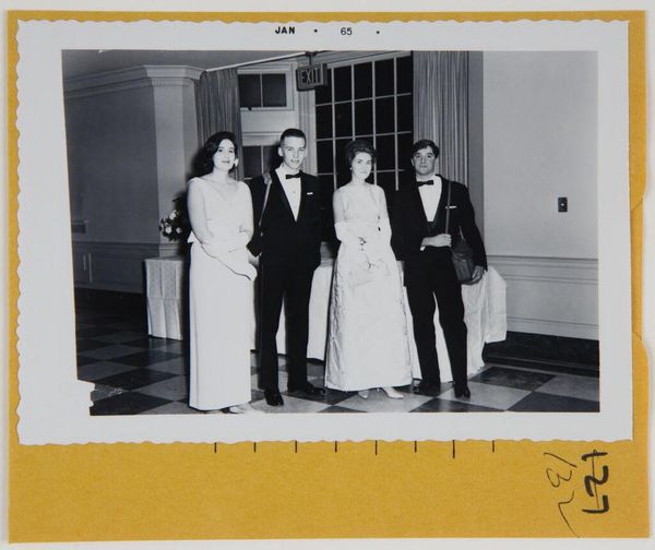 Editor: This photograph, "Untitled (cutting the cake)" by Martin Schweig, captures a wedding moment. The sharp contrast between the white cake and the surrounding darker tones immediately draws my eye. What compositional elements stand out to you? Curator: The photograph's strength lies in its geometry. Consider the receding planes established by the figures and the cake, the way the artist uses light to define form and texture, and the lines converging towards the center, directing our gaze. Do you observe any disruptions of this visual harmony? Editor: Well, perhaps the asymmetry of the figures around the cake? Curator: Precisely. This controlled asymmetry injects a subtle dynamism into what could have been a static scene. The photographer is less interested in the 'wedding' and more interested in form, light, and geometry. Editor: I see it now. It's like Schweig deconstructs the moment into shapes and tones. Curator: Indeed. By attending to these formal elements, we understand the artist's intent beyond the subject matter.