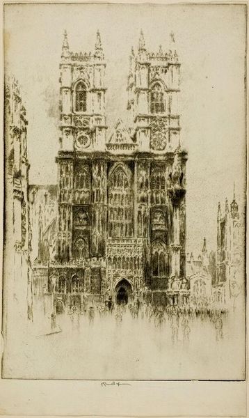 Curator: This etching from 1906 is titled "St. Augustine's and St. Faith's" by Joseph Pennell. It presents an urban landscape dominated by the towering architecture of two churches. Editor: There's something about the perspective that's immediately striking. It's narrow, almost claustrophobic, focusing the eye skyward towards those incredibly detailed spires. Curator: Pennell's printmaking process emphasizes the line work, a tangible result of the artist’s hand skillfully working the plate. His work gained renown through reproduction and distribution, shaping a broader perception and perhaps romanticized version of cityscapes. Editor: Absolutely. The choice of etching speaks volumes. It allows for such fine detail and the subtle gradations of tone create this almost ethereal atmosphere. There's also a kind of social stratification evident. We have these imposing churches literally looming over figures below—a powerful visual metaphor. Curator: Think also about the marketplace this etching inhabited: affordable prints for the rising middle class eager to consume images of European grandeur, creating their own versions of a modern Grand Tour through reproductive prints. Editor: And how does that relate to contemporary society? Do we still seek to embody ourselves within images of power or historical grandstanding, even at the expense of erasing other voices? Curator: It prompts consideration of labor involved – from the artisan crafting the plate to those individuals consuming this cityscape print. A constant negotiation occurs. Pennell was actively engaging with that. Editor: Ultimately, Pennell gives us more than just buildings; he provides us with the physical manifestation of power structures. I can almost hear the echoes of societal complexities humming in the air above the narrow streets, making the viewer reflect on their location. Curator: I agree; by understanding the tools and the economic and social currents Pennell participated in, our comprehension is enriched far beyond just pictorial elements. Editor: Indeed. "St. Augustine’s and St. Faith’s," a piece with threads that reach both backward and forward through time.