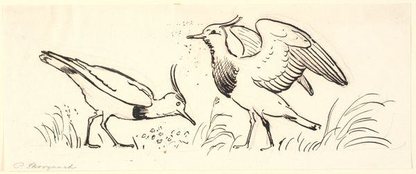 Curator: Maurice Pillard Verneuil crafted "Hermines vulgaires" in 1897, employing watercolor to render these stoats within a simplified landscape. Editor: Immediately striking is the cartoonish quality. It almost looks like a children's book illustration, but something about the posture and details creates an undercurrent of unsettling energy. Curator: Observe the restricted palette. The earth tones create a shallow picture plane; notice the way Verneuil layers the russet, beige, and brown washes. Even the slender trees fade into the background, acting merely as a suggestion of forest. Editor: Right, the ermine themselves dominate. In many cultures, the ermine represents purity, even royalty. Yet here, despite that history, they appear almost grotesque with their elongated forms and somewhat frantic gestures. Perhaps Verneuil subverts the traditional symbolic meaning? Curator: That is possible, yet the animal is also caught between its symbolic status as a winter prize, due to the fur that goes entirely white, against its basal life of an often very effective, small predator. The watercolor rendering is particularly deft when rendering the dark shadows against a light body. There is a suggestion that they move too quickly to capture, perhaps an element in its initial production as a print? Editor: Precisely. The exaggerated lines and caricatured expressions point to the duality inherent in their portrayal – are they emblems of virtue or subjects of satirical observation? The juxtaposition raises a cultural paradox. Curator: Indeed. In closing, the simplified shapes and the subdued colours combine to create a subtle interplay. A beautiful capture! Editor: And perhaps a clever deconstruction of established iconography too – offering a reminder that familiar symbols may conceal unexpected nuances. Thanks for the conversation.