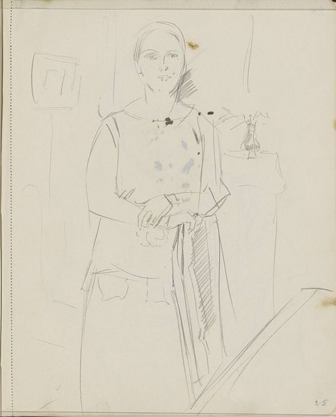Curator: This drawing, entitled "Woman with Headscarf in a Door" is attributed to Max Beckmann. The medium appears to be pencil on paper, presenting us with an intimate, almost stark image. Editor: It’s deceptively simple. The almost naive lines give a certain monumental, heavy quality. The very bare-bones execution almost underscores how the image feels constrained. Curator: Well, and it's important to situate an image like this within the broader socio-political context of Beckmann’s career. We have a figure here who’s quite clearly framed within an architectural threshold. In a literal sense it indicates a woman in an enclosure. Editor: Yes, and if we look closely, it seems this entire page exists as another boundary—it's clearly a page pulled from a sketchbook. Beckmann seems preoccupied with making art _out_ of the very tools and materials used to initially record it: line, form, texture, the paper itself. I think his choice to render this figure solely in a skeletal form gives precedence to his choice of process over detail. It's all just right in your face. Curator: Exactly, Beckmann and many of his Expressionist colleagues faced intense scrutiny, not only by critics who felt the works to be unfinished, but due to socio-political circumstances regarding art, culture and freedom. By using these types of raw strokes and depictions, he was critiquing conventional portraiture, which was very provocative. Editor: And I think we cannot avoid mentioning the headscarf in terms of materiality and context. Not just a covering, but also a marker. In these postwar drawings, its an interesting cultural phenomenon because it conceals, perhaps marks someone who’s been displaced by war, in addition to representing so much more for the person adorned in such manner. Curator: Absolutely. Ultimately this simple drawing encapsulates a really interesting tension between artistic expression, socio-political commentary, and personal experience. Editor: It seems so ordinary, but those marks alone make this a window to another place, another process, another way of thinking about making and about marking identity through making. It has an emotional weight despite its simplicity.