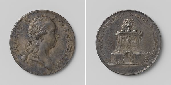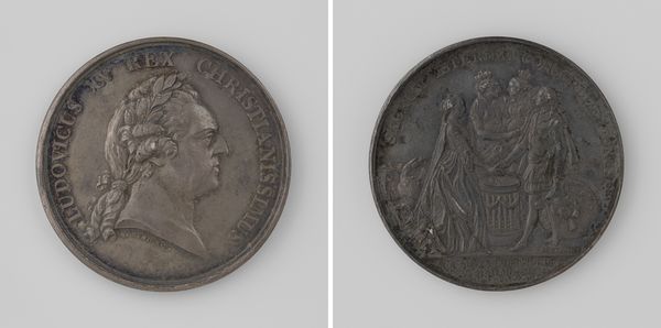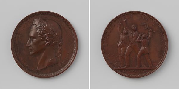 Curator: Here we have Jean-Pierre Droz’s bronze medal featuring Napoléon I. Editor: My first impression is one of stark contrast. The laurel-crowned portrait seems almost serene compared to the dramatic scene on the reverse. Curator: Indeed. Droz was a master of coin and medal design, and this piece speaks volumes about the complexities of power and image-making during Napoleon's reign. The imagery on the reverse is particularly fascinating. Editor: Absolutely! We see a figure, perhaps Hercules, wrestling a serpent. It’s a potent symbol of triumph over adversity, the hero subduing chaos. It represents strength and resolve. Curator: And that visual language was deliberately chosen to bolster Napoleon's image. The medal functions as propaganda, associating him with classical ideals of leadership and virtue. Editor: A brilliant synthesis of political agenda and artistic expression. It really shows the power of imagery, doesn't it? Curator: It does, making us question the relationship between history and manufactured image. Editor: It has me pondering the durability of symbols and their power to shift meaning over time.