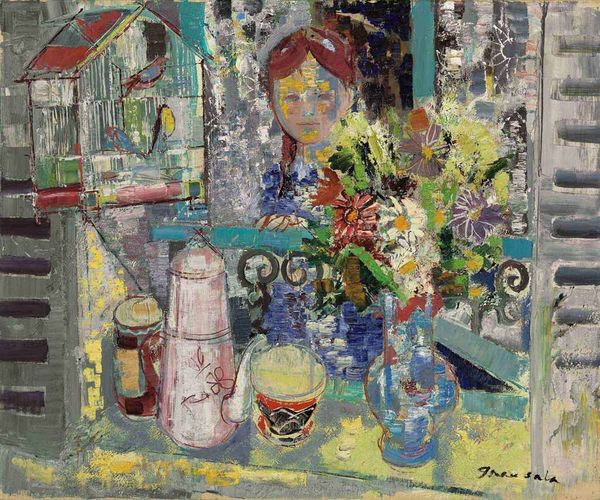 Emilio Grau Sala made this painting, "Le petit déjeuner", using oil paint in loose brushstrokes that give the whole scene a kind of shimmering energy. It feels like you’re catching a glimpse of a private, everyday moment. Look at how the paint is applied, thick in some areas, like the child’s hair, and thin in others, almost transparent in the background. The palette feels joyful but slightly dissonant, with the yellows and greens sitting against the purples and reds. It’s a domestic scene, but also something a bit weirder – the shapes feel almost Fauvist with the simplified planes of colour. See how the artist repeats certain gestural marks throughout the composition? Notice the curved strokes defining the figures echo the leaves in the background. Grau Sala’s work reminds me a little of Bonnard; that same feeling of intimacy and off-kilter color. These artists show how painting isn't about capturing reality perfectly, it’s about creating a world, or a feeling, on canvas.