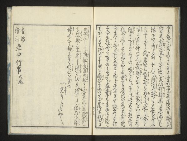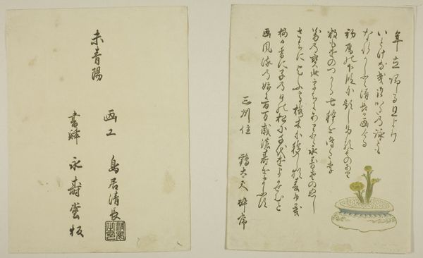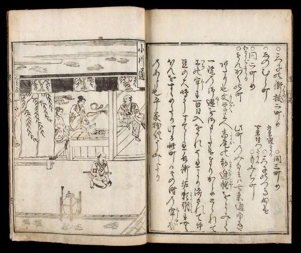 Editor: This is "Promulgation of the Contemporary Tea Ceremony" by Endō Genkan, dating back to 1694. It’s ink and color on paper, part of a book. I find the density of information fascinating, yet intimidating. What's your take on it? Curator: I see a powerful commentary on accessibility and cultural preservation. Here we have what appears to be instructions on tea ceremony, but framed within a socio-political context. Who has access to these traditions? How are they disseminated, and what power dynamics are at play when someone chooses to document or 'promulgate' them? Editor: That’s an angle I hadn’t considered. I was just focusing on the individual diagrams. Curator: Look closer. Is this really just a manual? Or is it a subversive act of democratizing a potentially exclusive practice? What does it mean to put something so refined, perhaps even secretive, into a form reproducible for the masses? Consider who traditionally controlled access to knowledge and ritual during this era in Japan. Editor: So you're saying it could be seen as a challenge to established social hierarchies? Curator: Precisely. How can artistic, social and ritual expressions democratize art and practices for all? It uses a seemingly benign subject—tea—as a vehicle. Can this also reflect larger themes of social progress? Editor: Wow. I initially saw just a quaint instructional guide. Now I see a potentially radical statement about who gets to participate in cultural traditions. Curator: Exactly! Thinking about art as intertwined with these issues helps uncover many fascinating layers!