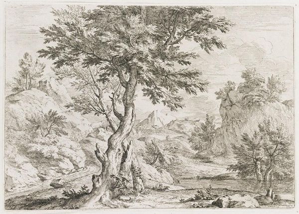 Curator: This is Paul Sandby's etching, "Trees and Huts with a Distant View of a Town by a River." Editor: It has a quiet, almost melancholic mood, achieved through delicate lines and a somber palette. The composition is interesting, with those trees taking up much of the foreground. Curator: Indeed. Sandby, who lived from 1731 to 1809, played a key role in establishing watercolor painting and etching as respected artistic mediums in Britain. This exemplifies his commitment to depicting the British landscape, making the ordinary picturesque. Editor: The visual language relies on contrasting textures and depth. The density of the foliage gives way to the open sky and distant town. The interplay of light and shadow creates a sense of spatial recession. Curator: He's definitely manipulating the conventions of landscape art to promote a sort of British national identity. Editor: Right, the etching process allows for dissemination of an image of domesticity. Curator: Sandby offers us not just a scene, but a reflection on art's power to shape our perception. Editor: I see now a conversation about national identity. Thanks.