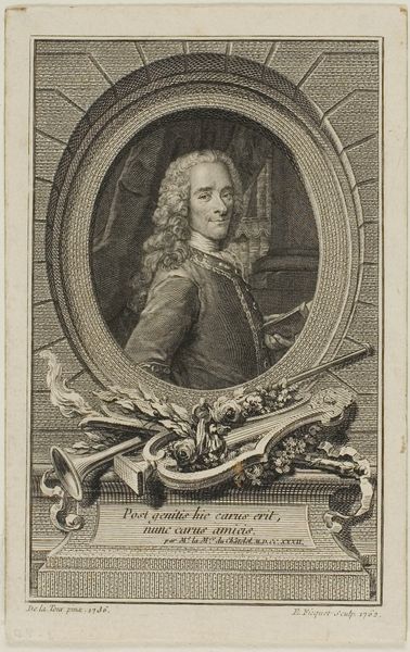 Editor: Here we have Étienne Ficquet's "Voltaire," a striking portrait. I’m immediately drawn to the crisp lines and the elaborate frame. What stands out to you, looking at the formal elements of this piece? Curator: The composition is meticulously structured. Notice how the oval portrait is framed by a rectangular border, creating a dialogue between curves and straight lines. Consider the tonal range achieved through the hatching and cross-hatching. Where do you see the deepest shadows and brightest highlights? Editor: I see darker areas around Voltaire's face, creating depth. The highlights seem to be on his hair and the musical instruments below. I appreciate the way the artist used line to create such a detailed image. Curator: Precisely. The linear precision and the calculated arrangement of forms indicate a mastery of the engraving technique. This work exemplifies how formal elements contribute to a powerful visual experience. Editor: I never thought about it in such a formal way. Thank you for pointing out these details!