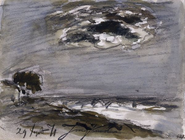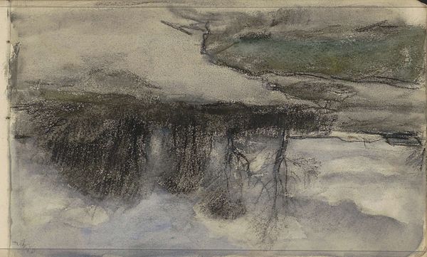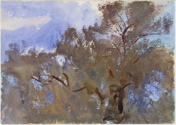 Curator: It feels… wistful, like a memory fading into mist. All soft edges and gentle washes of color. Editor: Indeed. What we have here is Fu Baoshi’s “Crows in a Willow,” a mixed-media painting from 1944, utilizing ink and watercolor to conjure this delicate scene. There is a strong social context to consider; the war was still raging as Baoshi developed his distinct style. Curator: War as seen through the eyes of birds, perhaps? Those dark, feathered clumps nestled in the bare branches...they become almost like watchful eyes amidst the chaos of it all. Are they grieving or simply observing? There is a quietness to the painting, that is unnerving. Editor: The motif of the crow does frequently appear in Chinese art, sometimes associated with mourning. Here, it may reflect a sense of melancholy, echoing China's wartime experience. Baoshi would later embrace socialist realism; interestingly enough, it was during this era he developed the technique of 'Baoshi cun', a term we now use to describe this rugged brushwork style of his. Curator: I can see it; that expressive looseness gives the willow such a stark, spindly character. The branches almost vibrate, which contrasts beautifully with the subtle gradations in the misty background. It is simple in its form and technique but complex in emotions. Editor: Precisely. This exemplifies Baoshi's fusion of traditional techniques with modern sensibilities. He transformed landscape painting into a vessel for expressing the emotions of a nation in turmoil. Curator: There's such elegance in its restraint, isn't there? Like poetry whispered on a windy day, about war and remembrance and sorrow all blurred at once. Editor: Yes, and to contextualize it, Baoshi became one of the foremost figures in what became known as the "New Chinese Painting" movement, attempting to integrate Western styles with traditional practices, moving forward the cultural expressions during that era. Curator: This little painting reminds me that even in the harshest seasons, something still watches, something still remembers, even when everything is gone or being threatened. Editor: It’s remarkable how a seemingly simple arrangement of ink and color can transmit such profound historical and individual reflection.