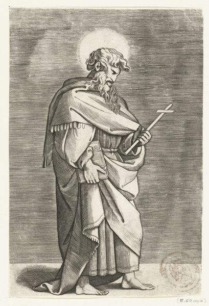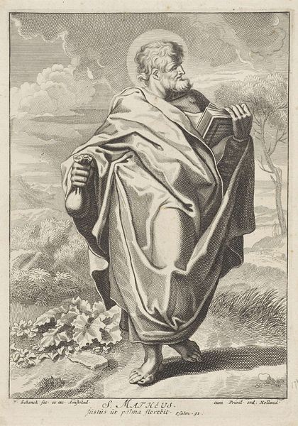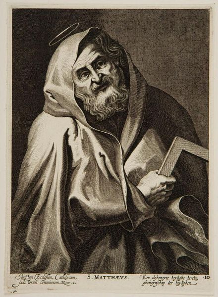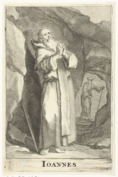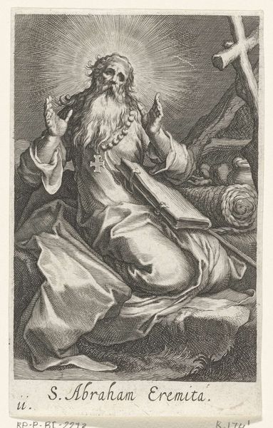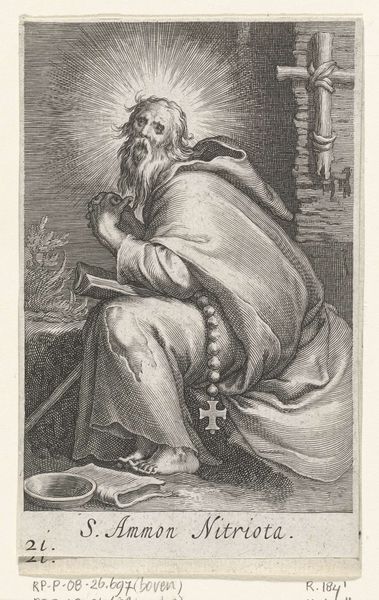 Editor: So, this is Hieronymus Wierix's "Saint Anthony Abbot," a detailed engraving. The saint seems so immersed in his book, beads dangling, and yet… he’s not alone in the wilderness. What strikes you most about this image? Curator: The tension, definitely. Wierix captures that internal struggle, doesn't he? The saint, the book, the rosary…but then, the almost hidden fox. It feels like a whispered temptation lurking. A reminder that even in solitude, the world persists. What do you make of the landscape? Editor: I hadn't thought about the landscape contributing to that feeling! I guess it seems bleak, almost like a psychological space, as much as a real location. Curator: Exactly! It's a landscape of the mind, isn't it? Wierix isn’t just depicting a saint; he's showing us the battle for faith, made visible.