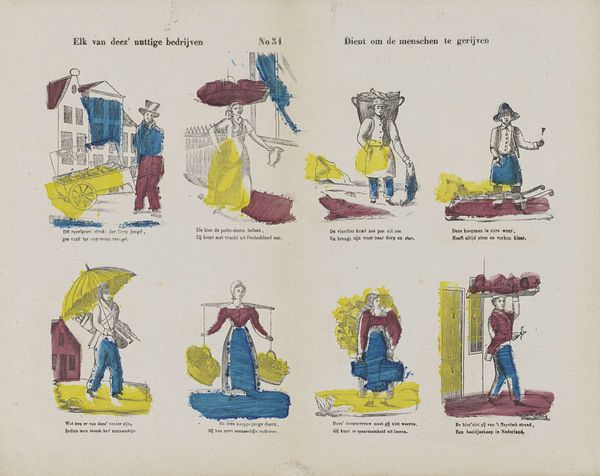 This print, made by Lutkie & Cranenburg, depicts a series of street vendors, each peddling their wares. It seems to be made through a combination of line drawing and hand coloring, a relatively inexpensive method of production that allowed for the broad distribution of images. What’s interesting here is the focus on labor, specifically, the informal economy. The images show workers carrying heavy loads: fish, milk, potatoes, and other goods essential to daily life. The backbreaking nature of the work is apparent, especially for the women depicted. These vendors occupied a marginal position in the Dutch economy; their labor was essential, yet they were often subject to exploitation. The print underscores how the production and distribution of everyday goods relies on a whole system of labor. By focusing on these tradespeople, the artists draw our attention to the often invisible hands that contribute to the functioning of society. It's a reminder that even the simplest things we consume have a complex history of human effort behind them.