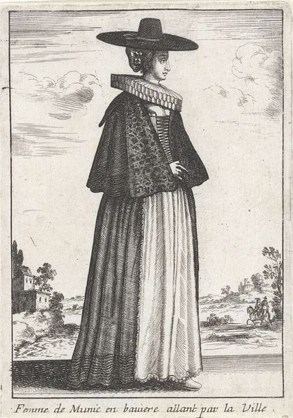 Curator: I'm struck by the starkness of this print. It’s called "Femme Villageoise de Anurons de Paris", depicting a woman from around Paris, and was made around 1662. The medium is engraving, that gives it such a graphic, linear quality. Editor: It feels very formal for a genre painting. She looks like she's posing for a portrait, with a basket of produce clutched rather delicately. The artist is noted only as "Anonymous". What do you think her placement within the landscape communicates? Curator: Well, her upright stance, set against that rather distant landscape, it suggests a figure of significance, maybe representing the idealized rural worker. Notice the details, her headscarf, the carefully rendered folds of her gown. It’s all incredibly intentional. And think about what an engraving can accomplish - these were often precursors to mass media, almost like visual "news" depicting different classes of people, places, costumes, to far away patrons or merchants, even for scholarly records. Editor: That’s a really great point about visual news! But even given that context, there’s an unmistakable air of privilege or at least, societal expectation here. While it intends to capture the image of a country woman, it certainly reflects how that country woman is perceived and presented, rather than being a real depiction of daily labor or routine life. This feels less about documentary realism and more about curating social imagery. Do we know if it had an initial patron? Curator: Sadly, its early history and patron, remain unknown. Her attire strikes me - this meticulous, if perhaps idealized, rendition of traditional clothing serves as a symbol of cultural identity and perhaps pride. It communicates an essence of this individual and class of person beyond that very individual, perhaps an essence or idealized element held up to even nobility or royalty. Editor: And what of that faint activity going on in the landscape behind her? Perhaps figures at labor or travel. Almost like a backdrop that’s less important than she is as a representation of, perhaps an imagined time and existence for the class? I’m looking at how she occupies the majority of the space, really foregrounding her, more so than any social narrative the landscape might have provided otherwise. It centers her and her "class." Curator: Precisely. I read that centering as part of the enduring visual language of idealization. Her steady, gaze speaks of self-assuredness and resilience—a celebration through simple symbolic and representative details. The act of observation preserved. Editor: And that observation reveals as much about the observer as it does about the observed. A crucial reminder for us, standing here centuries later. Thank you!