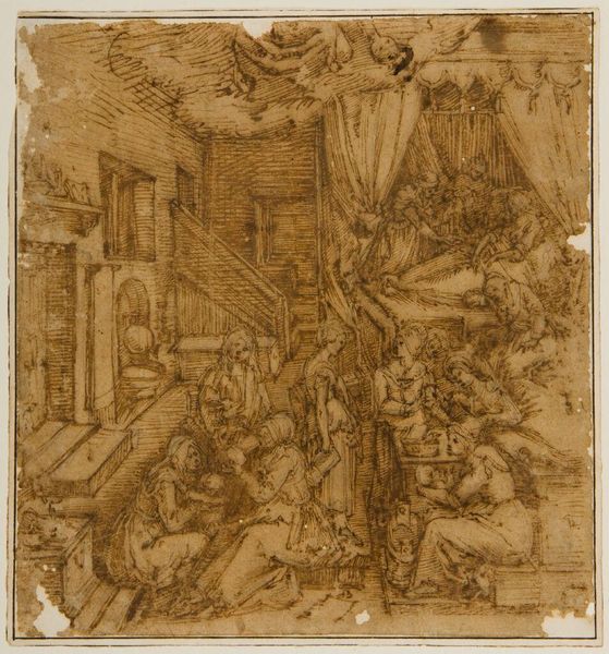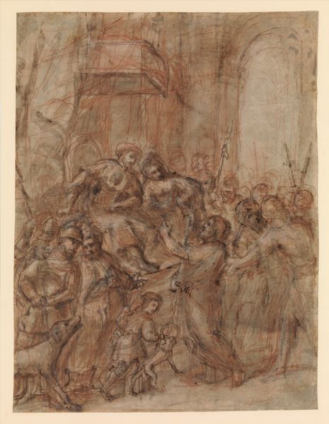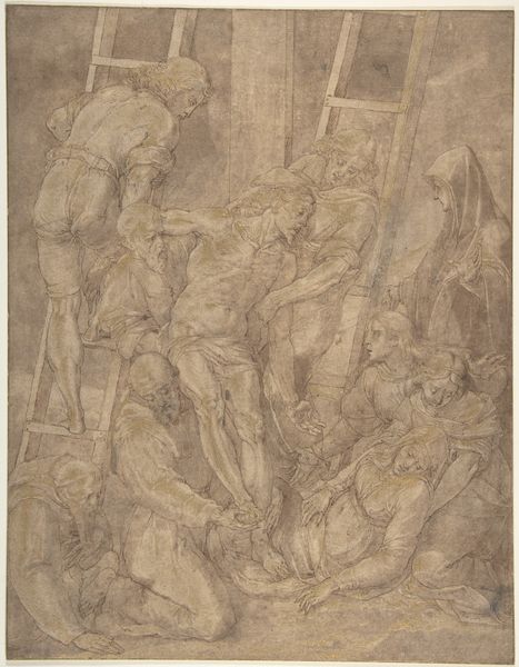 Curator: This drawing is entitled “Deposition, with Saint Francis of Assisi and Another Male Saint (Stephen?)”, created circa 1576 by Simone de Magistris. It employs pen, ink, black chalk, and gouache on paper. Editor: What immediately strikes me is the precariousness of the moment. The figures are rendered in dynamic poses, crowded around a ladder and cross, emphasizing the instability and the delicate act of lowering Christ’s body. The warm tones add a certain gravity. Curator: Precisely. De Magistris, working within the Mannerist style, was deeply involved in the artistic and religious climate of his time. The late Renaissance period was fraught with religious and political upheaval, significantly influencing artistic expression. This drawing highlights the social and spiritual dimensions of the deposition narrative. Editor: The inclusion of Saint Francis is particularly interesting. His presence signals themes of empathy and human connection to divine suffering, which resonated powerfully during periods of social change. The viewer is invited into an emotional and psychologically fraught moment. What is Saint Francis’ role at this time? Curator: Well, his inclusion certainly adds a layer of meaning. St. Francis was experiencing quite a resurgence in popularity in the late 16th century. By inserting him here, de Magistris makes explicit the devotional function of the image, reminding viewers of the need for personal piety and active engagement with the suffering of Christ. Notice, too, the compositional debts the work owes to centrally Italian artists. Editor: Absolutely, the pyramidal arrangement of figures directs our gaze, amplifying the emotional impact of the scene. There’s almost a visual tension mirroring the tension felt by those lowering the body. What always stays with me when viewing this scene, is not just its symbolic power, but its deeply felt humanity. It serves as a stark reminder of mortality, devotion, and the shared human condition. Curator: Yes, looking at the museum records we know it would’ve been intended to be made into a print so we, the viewer, should see that and its ultimate accessibility to devotion through the printed format. Editor: And through that, our ability to connect with history, and human emotion over time. A poignant work offering an intimate view into both artistic practice and religious sentiment of its era.