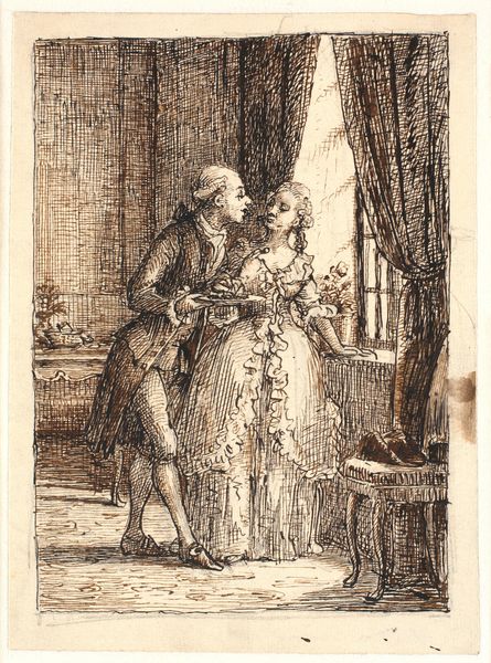 Wilhelm Marstrand created this sketch, "Visit hos hendes nåde," using pen and grey ink on paper. The process of sketching is an interesting choice here; it's quick, immediate, and often used for preparatory work. The visible strokes and shading reveal the hand of the artist, with the thin ink allowing Marstrand to achieve fine detail and subtle tonal variations, particularly in the rendering of fabrics and faces. Look at the expressive lines that define the figures and the soft, diffused shading that suggests form and volume. The sketch aesthetic lends a casual air to the scene. The medium itself suggests a moment captured on the fly, rather than a grand, labored composition. In this context, it reflects the burgeoning middle class and their interest in scenes from everyday life. Sketching gains prominence as both a means of artistic study and a form of personal expression, aligning with broader social shifts towards individualism and the celebration of the everyday.