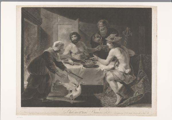 Editor: This engraving, "Bespotting van Ceres," made after 1795 by Jacques Louis Copia, depicts a scene of classical realism with three figures. It feels very staged and formal, not exactly inviting. How do you interpret the symbolic weight of the scene? Curator: It is intriguing, isn’t it? Consider Ceres, the Roman goddess of agriculture, shown here being mocked, which carries substantial cultural memory. The Neoclassical style aims to evoke virtues of the ancient world. How does the presence of the child – presumably Cupid – influence your perception of the allegory? Editor: I suppose it adds an element of cruelty; a spoiled child defiling something sacred. It's odd— I wouldn’t have expected that interpretation. Curator: Indeed. Recall that Ceres's role was vital – the cycle of crops determined the well-being of communities. The act of spoiling could thus symbolize something broader: ingratitude or wastefulness towards the very things that sustain us. What continuities do you notice with contemporary attitudes towards environmental stewardship? Editor: I see what you mean. Maybe that's why it feels so unsettling – this disrespect is still relevant. It hits differently now that you point out the cultural weight. Thanks. Curator: And thank you. Reflecting on these classical images helps us view our current challenges through a rich symbolic lens.