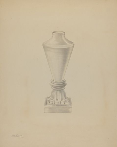 Editor: This is John Dana’s “Spark Lamp,” a pencil drawing from around 1936. It’s a really delicate rendering. I’m curious about what message you see in it. Curator: Immediately, the stylized form of the lamp strikes me. It harkens back to classical urns and vessels, which, through the centuries, have symbolized both remembrance and domesticity. The transparent material, meticulously rendered in pencil, suggests fragility and perhaps the fleeting nature of illumination itself. Editor: That's interesting. I didn't pick up on the reference to classical forms, but it's definitely there now that you mention it. The fragility of the material makes the idea of 'spark' so prominent. It's like a short but impactful spark of life that contrasts the lasting physical form. Curator: Precisely! Dana's choice to depict a lamp – an object designed to cast light and dispel darkness – carries strong symbolic weight, particularly given the era. Does this piece evoke any historical events or social sentiments related to light, technology, or hope from the 1930s? Editor: Now that you point that out, I guess the 1930s could be the era of electricity spreading further into households. A spark is now safe and accessible, domesticated in a way. The drawing itself domesticates something classical. I don't know, maybe this represents societal change! Curator: Excellent point! It shows cultural memory intertwining with current events, illustrating an era on the cusp of modernization but still rooted in tradition. Editor: Thank you for these insights, this piece becomes a time capsule with all these combined considerations. Curator: Indeed. The drawing is more than meets the eye—a quiet meditation on memory, progress, and the enduring human quest for enlightenment.
