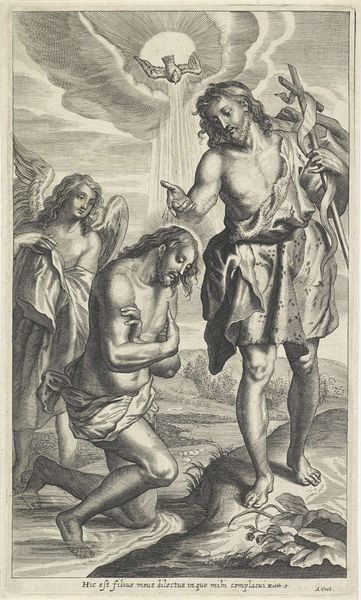 Editor: This is Johann Georg Bergmüller's "Baptism of Christ," housed at the Harvard Art Museums. I am struck by the contrast between the soft, almost cherubic angels and the more muscular, grounded figures of John and Jesus. What do you see in the piece, looking at it through a historical lens? Curator: The visual dichotomy you point out reflects a complex theological message, mediated through artistic convention. Consider how Bergmüller navigates the visual language of power, divinity, and human representation within the evolving social and religious climate of his time. What role do you think patronage played in shaping this imagery? Editor: I guess the Church wanted to show both the heavenly and earthly aspects, so they hired Bergmüller to depict both the strong earthly figures, but also those soft, cherubic heavenly figures, in order to reach a wider audience. That's interesting. Curator: Exactly! And think about how the public's access to and interpretation of such images were carefully managed by religious institutions. The art was a tool for communication, a point for engagement, and a display of power. Editor: It’s amazing how much historical context influences what we see in a work of art.