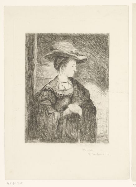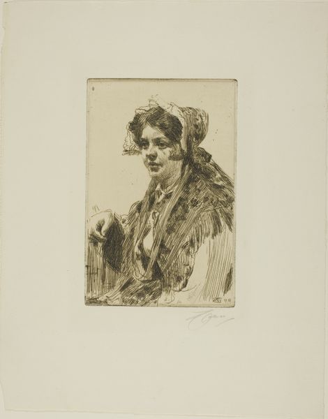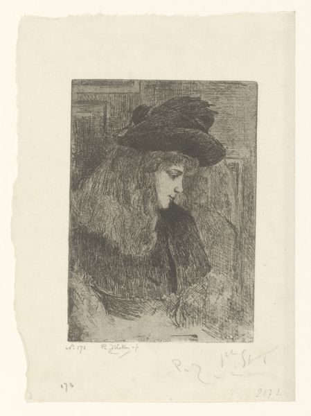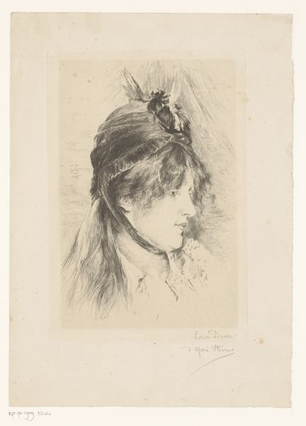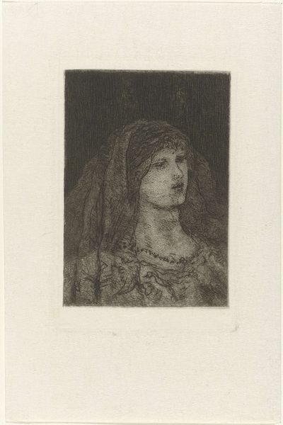 Editor: This is "Portrait of an Unknown Young Woman with Flowers," an etching by Frans Lauwers created sometime between 1864 and 1911. I'm really drawn to its dreamy, ethereal quality, like a faded memory. What catches your eye about it? Curator: What I find fascinating is the bouquet she holds. Flowers have been used symbolically across cultures for centuries to express everything from love and mourning to rebirth and warning. I wonder what narrative Lauwers intended by placing that specific collection of blooms in her arms? The “unknown” subject is an open door into the collective conscious, it could be any one of us holding hope, memory or beauty in our hands. What message about memory or loss could it convey, given the etching's delicate and almost melancholic nature? Editor: That’s a compelling point. I hadn't thought about the individual flowers and their specific symbolic weight. Are you suggesting that even the woman’s expression might contribute to this symbolic language? Curator: Precisely. Her downcast gaze, combined with the delicate lines of the etching technique, evoke a sense of wistful introspection. The Romantic era in which this portrait belongs was filled with intense emotion, nature as the sublime force, the power of beauty and nature was everywhere. Considering that many people during the time would study “floriography”, or language of flowers, it’s worth noting what specific messages the blooms she is holding. A question, not necessarily one answered, to deepen appreciation and wonder. Editor: So, it’s not just a pretty picture, it’s a carefully constructed statement loaded with meaning? I find that shift in perspective incredibly interesting. Thank you! Curator: Exactly! This work becomes a portal. These images create pathways to cultural knowledge, a beautiful synthesis to enrich the contemporary mind!