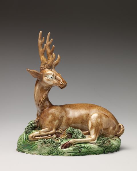 Editor: Here we have a ceramic sculpture, "Doe (one of a pair)" crafted sometime between 1775 and 1785 by Ralph Wood the Younger. I'm immediately struck by its serene posture, it seems very delicate. What layers of interpretation does this piece unlock for you? Curator: This sculpture, part of a pair, speaks volumes about 18th-century sensibilities and their connection to the natural world. But, let's look at it through a lens of class and privilege. Do you consider where decorative objects like this would have been displayed and by whom? Editor: Probably in a wealthy home, adding to the ambience. But what’s particularly telling about that? Curator: Precisely. These were status symbols, reflecting the owner's refined taste and access to luxury goods. While seemingly innocuous, such portrayals of nature conveniently elided the realities of a rapidly industrializing England – land enclosure, the exploitation of natural resources, and the disruption of rural communities. It presents a highly sanitized and aestheticized vision of nature, available only to the elite. How does the ceramic medium itself factor into this reading for you? Editor: I suppose the fragility underscores the protected, almost idealized status of the animal and the environment it represents, completely detached from any notion of wilderness or ecological struggle. Curator: Exactly! This idealized representation obscures more complex relationships between humans and the natural world. Think, too, about the cultural meanings associated with deer, often symbols of feminine virtue or pastoral leisure, further distancing them from the lived experiences of most people. Editor: I never considered the object's cultural and socio-economic context so thoroughly before. Curator: It reveals how even seemingly harmless art can be deeply embedded in social power dynamics and ideological projects. Editor: Thank you. I now have a richer perspective on art's complex relationship to history and social class.