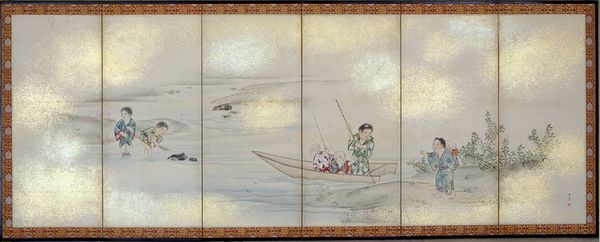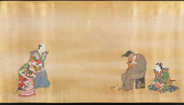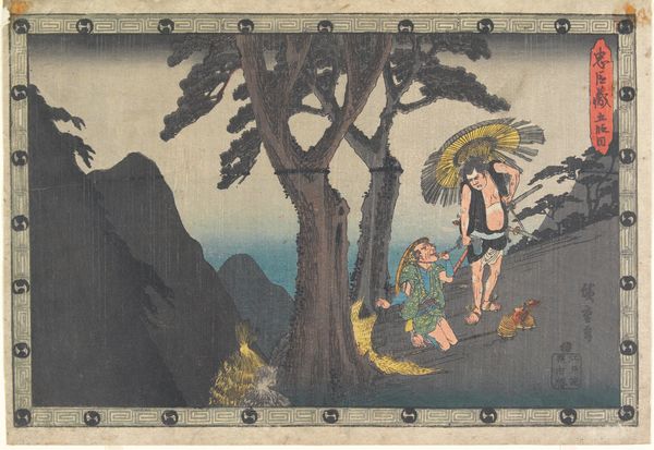 Editor: This is "Monkey Showman and Porter(?) in the Snow" by Hokuga, dating from somewhere between 1800 and 1868. It’s a watercolor print, and there's such a sense of cold and isolation in the image. What do you see here in terms of its historical relevance? Curator: I see a snapshot of Edo period entertainment and its place within the broader socio-economic structure. These itinerant performers, traveling in harsh conditions, highlight the everyday realities for those outside the elite. The "Monkey Showman" would have been a familiar sight in urban and rural settings alike. Editor: So the monkey show was a common form of entertainment? Curator: Yes, but it represents more than just a street performance. Consider the economics of it. Who is consuming this form of entertainment, and what does their patronage reveal about the distribution of wealth? How did socio-political restrictions on travel impact itinerant performers like this? Editor: It's interesting to think about art not just as aesthetic, but as part of the broader political economy of the time. The snow really emphasizes the harshness of that lifestyle. Curator: Precisely. And think about the act of representation itself. Why depict this subject matter? Was it simply a picturesque scene, or was there a commentary, subtle or otherwise, on the lives of those struggling to survive in Edo society? Also, consider the role of the patron who would have commissioned or bought this print. What was *their* relationship to the image, the scene represented, and the social classes involved? Editor: So, it's less about what’s literally depicted and more about who is viewing it, and *why*. I never considered it that deeply before. Thanks! Curator: My pleasure! Understanding the social and institutional frameworks surrounding art creation and consumption is crucial for a fuller understanding.