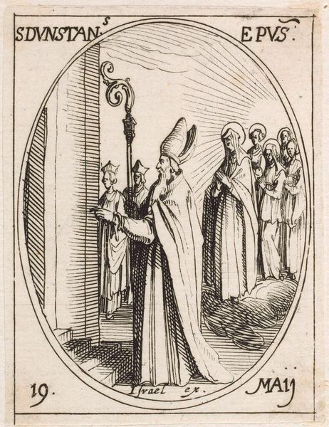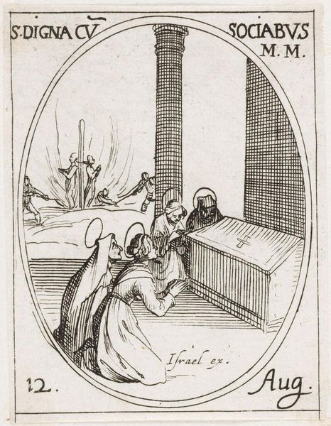Curator: This is Jacques Callot's "Deposition of the Virgin," a small engraving measuring only about 7.6 x 4.9 cm, currently held at the Harvard Art Museums. Editor: It's incredibly detailed for such a tiny piece. The crisp lines give it a stark, almost severe feeling, and the way the figures are arranged feels so staged and deliberate. Curator: Callot was a master printmaker, renowned for his technical virtuosity in etching and engraving. He captures religious and secular life during a period of conflict, giving us glimpses into the history of devotion. Editor: Look at the labor involved in creating such fine lines! And consider the social aspect too - the tools, the workshop, the market for these religious images in early modern Europe. Curator: Absolutely. These prints circulated widely, shaping religious and cultural attitudes. Editor: Indeed, a potent reminder that even something small can carry significant material and cultural weight. Curator: A powerful intersection of craft, devotion, and the shaping of social narratives, wouldn't you agree?