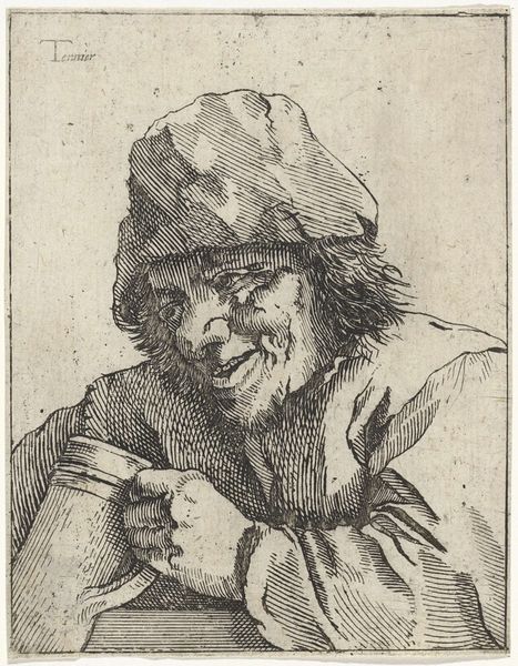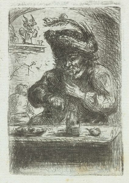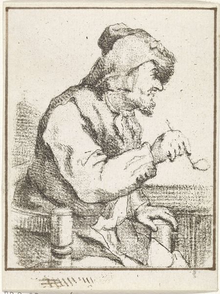 This etching of a ‘Smoking Peasant’ was made by Adriaen van Ostade, a Dutch artist working in the 17th century. Ostade made many images of working people, and this one gives us a sense of the textures and tones that were possible with the etching process. Lines are created on a metal plate using a sharp needle, then acid is applied, biting into the metal. The deeper the bite, the more ink the line will hold. The plate is then inked and pressed onto paper. Notice the density of lines used to define the figure’s face, and clothing. Ostade created a range of light and dark effects with just a few simple tools. While etching may not be as physically demanding as some other art forms, such as sculpture, it still requires considerable skill and precision. The resulting print gives us a window into the life of a 17th-century peasant, while also showcasing the artistry and craftsmanship of the printmaking process.