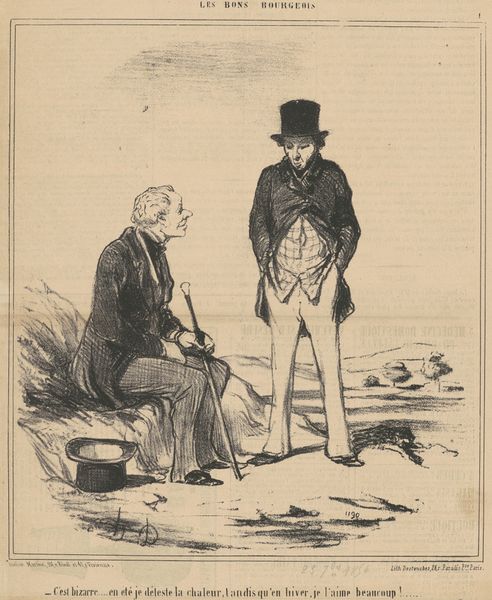 This is “Ne laissez donc pas votre ami dans cet état la!” by Honoré Daumier, a lithograph likely created in the mid-19th century, a period marked by significant social upheaval in France. Daumier was a keen observer of Parisian life, and his work often critiques the bourgeoisie. In this piece, we see a well-dressed man attempting to support a disheveled, older man, while another lies prone in the background. The caption hints at the heart of the piece, highlighting the intersection of class and social responsibility. The stark contrast in attire and condition between the figures underscores the economic disparities of the time. Daumier masterfully uses caricature to expose social truths, inviting us to reflect on the empathy, or lack thereof, within different strata of society. He challenges the viewer to consider their role in a society deeply divided by economic status, and asks us, then as now, to confront the precarity of human dignity.