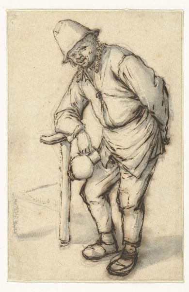 Curator: Here we have "Kneeling Boy Binding Brushwood" rendered in charcoal, attributed to Adriaen van de Velde, although its exact date remains elusive. It resides here with us at the Städel Museum. Editor: Mmm, spare and touching. The reddish-brown charcoal imbues it with such warmth, don’t you think? There's a certain vulnerability to this solitary boy, bowed in labor, the sticks resembling fragile bones… I wonder about his story. Curator: Well, depictions like these were not unusual in 17th-century Dutch art, especially within the context of genre painting. Artists began finding nobility in everyday life. But you know, these were not always accurate. Van de Velde also created hunting scenes for aristocratic audiences. Were these to celebrate country life, or merely to remind those with wealth of those who served their lavish habits? Editor: Possibly both. Art, even when seemingly simple, often carries that sort of loaded ambiguity, a reflection of the society that produces and consumes it. You see his coat and tell if it is simple protection, I can easily assume a class system. This work seems particularly grounded by his task, as if held prisoner by necessity. His face remains unseen to us but there’s profound intimacy captured in this fleeting moment of focused concentration, almost pained. Curator: And that contrast is powerful, between the particularity of his gesture and the lack of a distinctive face, perhaps that is deliberate. Consider, too, how the art market during this period fueled the development of genre paintings and depictions of rural life. There was a real fascination, even a hunger for the humble made picture-worthy! And also how important this drawing would have been. Many artists would use figure studies, sketches if you like, for much larger paintings that contained small human figures and they had to be correct. Van de Velde also uses a style from the Italian Baroque, it adds depth. Editor: Absolutely! Van de Velde seems acutely aware that observation has the power to shape narrative, influence perspective. It seems as though the bow in his body resembles the willow beside him, binding the same as being bound. There is something intrinsically haunting about witnessing everyday struggle rendered so artfully. Curator: It makes you wonder, doesn't it? It’s the delicate balance, you know, between observing, celebrating, and possibly romanticizing these figures and stories…it can give one cause to consider. Editor: Indeed, a humbling reminder that even in the smallest, simplest images, history and emotion intertwine, prompting endless stories, really.